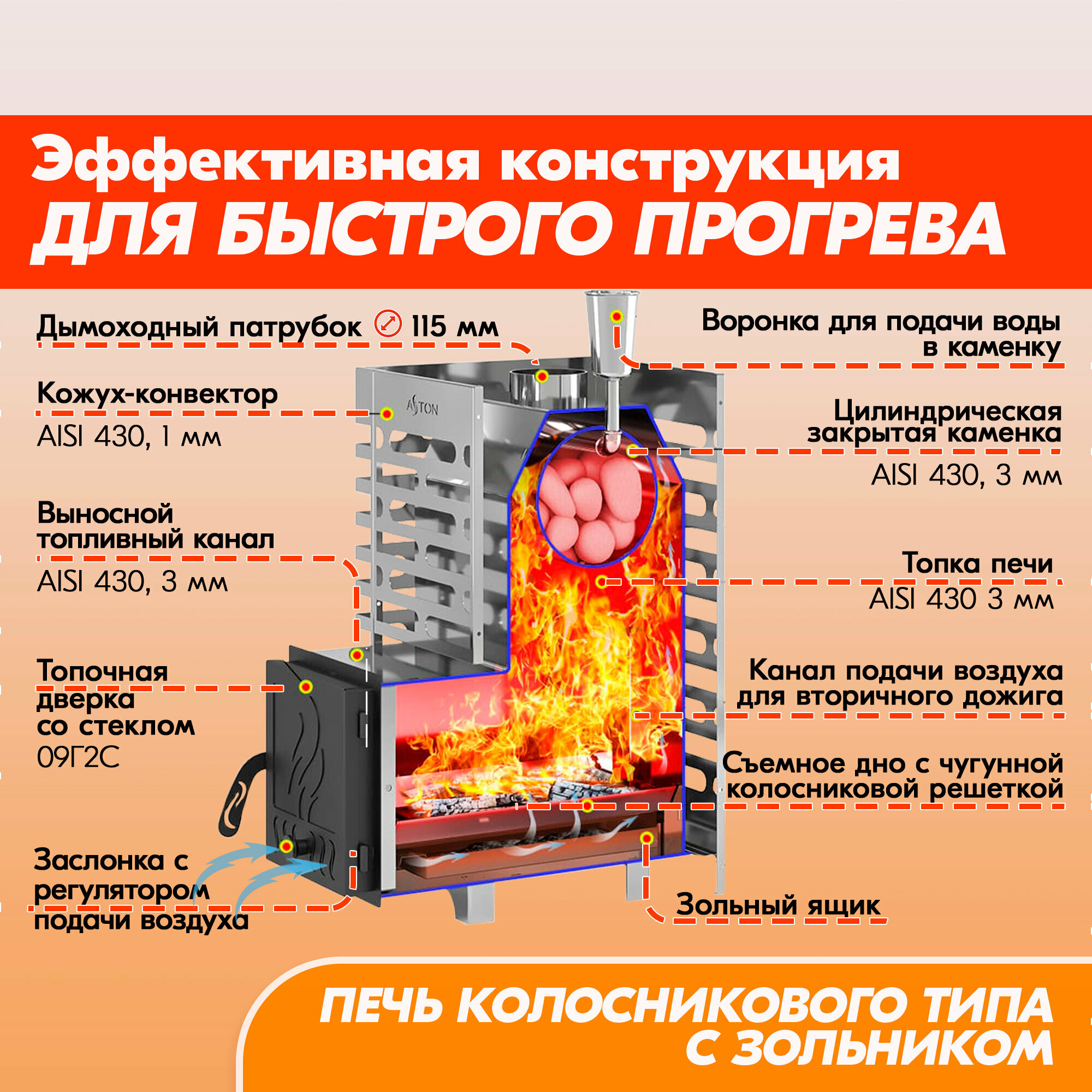 Печь для бани ASTON 20 INOX дровяная с закрытой каменкой