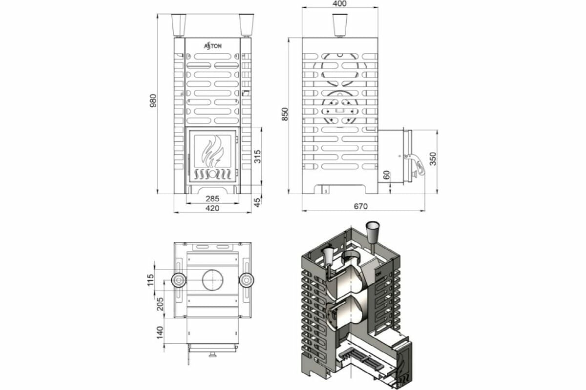 Печь для бани ASTON 20 дровяная с закрытой каменкой и стеклом