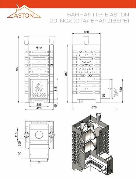 Печь для бани ASTON 20 INOX дровяная с закрытой каменкой