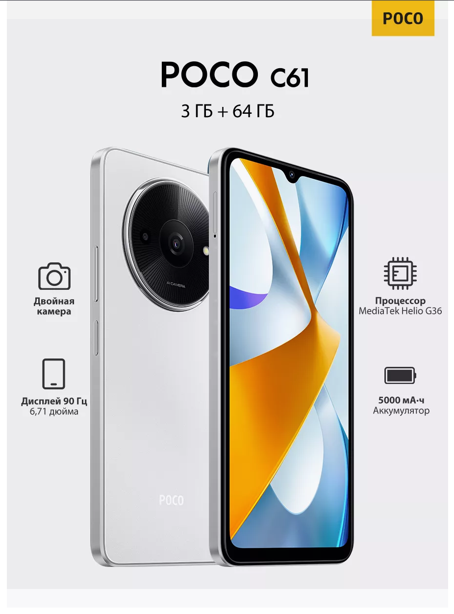 Смартфон XIAOMI Poco C61 3/64 ГБ, Dual nano SIM, белый