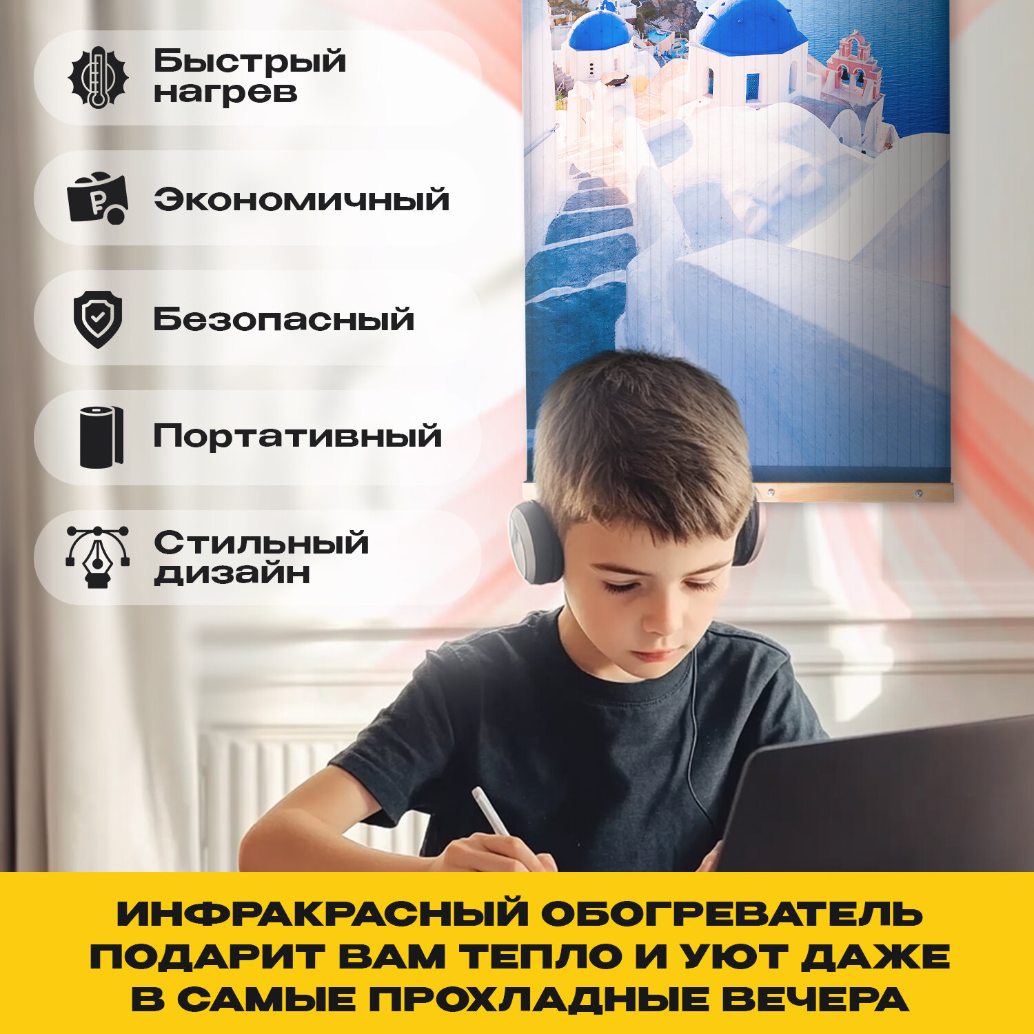 Настенный обогреватель инфракрасный, 150х60 см Санторини Totmart, работает с умной розеткой