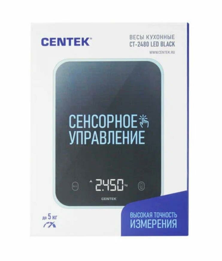Купить Весы бытовые Centek CT-2480 LED BLACK, сенсор, 150х15х205мм, max 5кг, шаг 1г, Авто Ноль/Выкл 61622