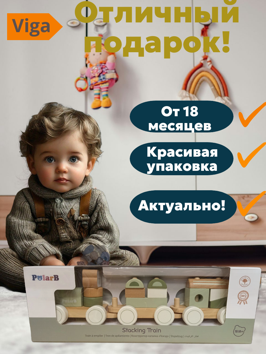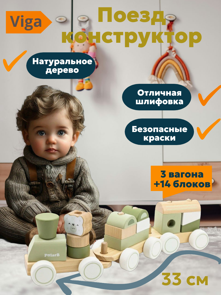 VIGA PolarB Конструктор-каталка Поезд (14 деталей + 3 платформы) зеленый 44231 с 1,5 лет