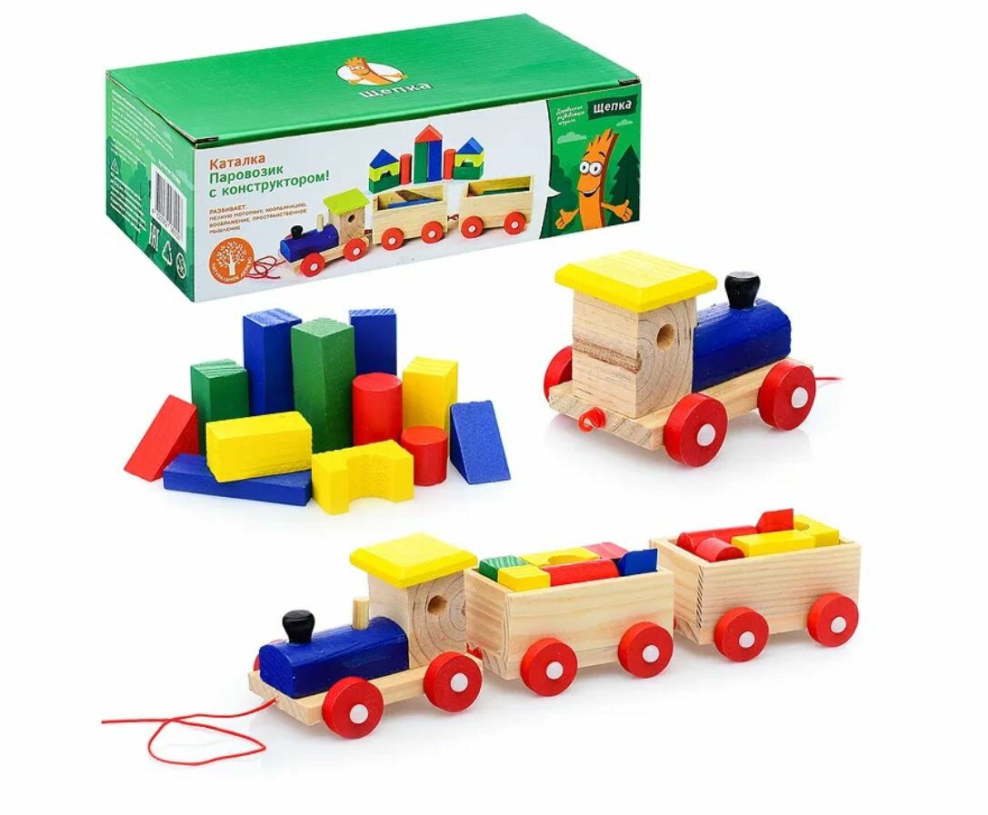Каталка детская деревянная Паровозик с конструктором интересное: