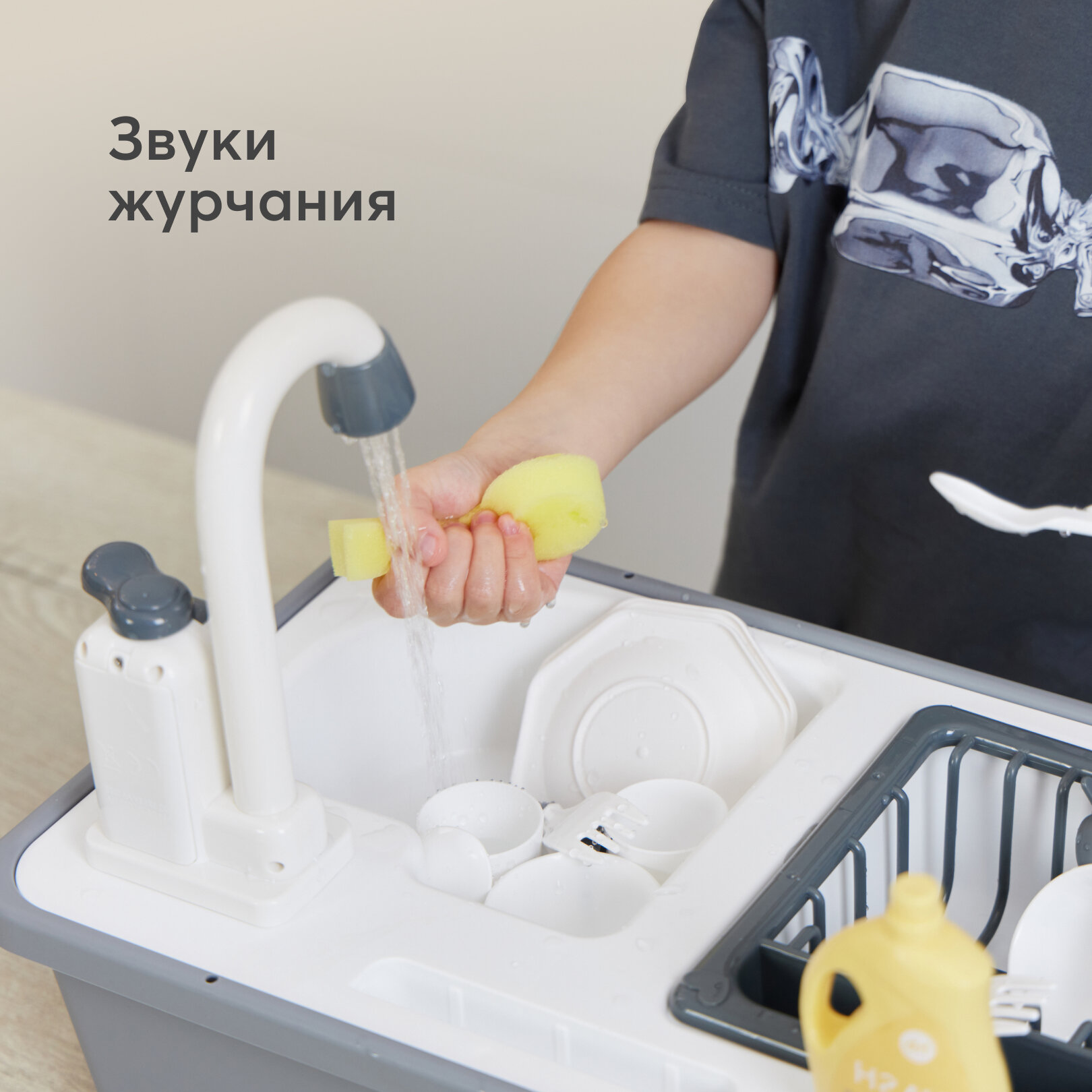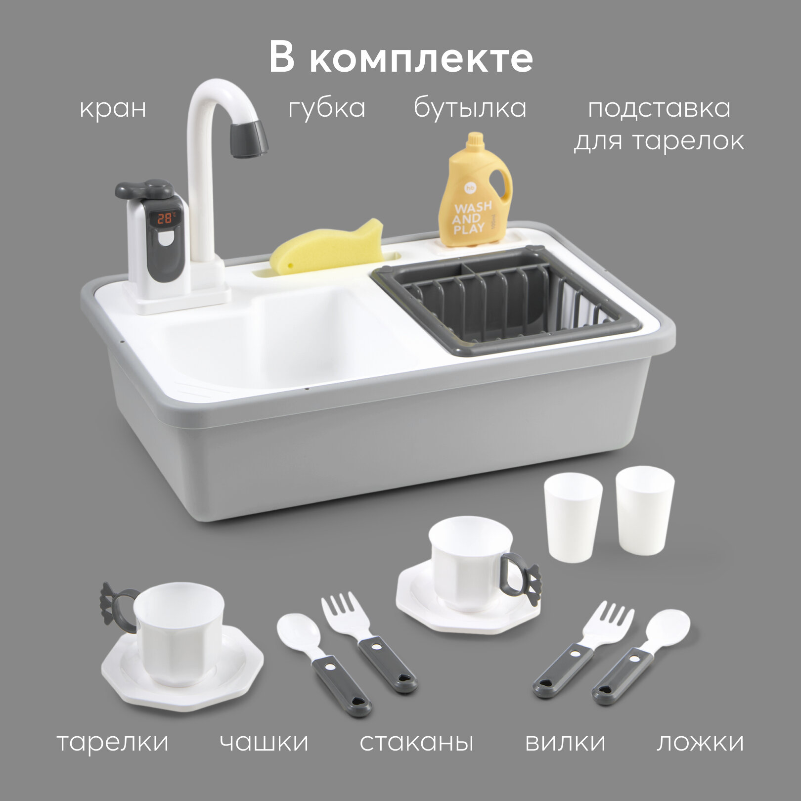 331869, Игровой набор детская кухня Happy Baby WASH AND PLAY игрушечная раковина детская с водой, 15 предметов, серый