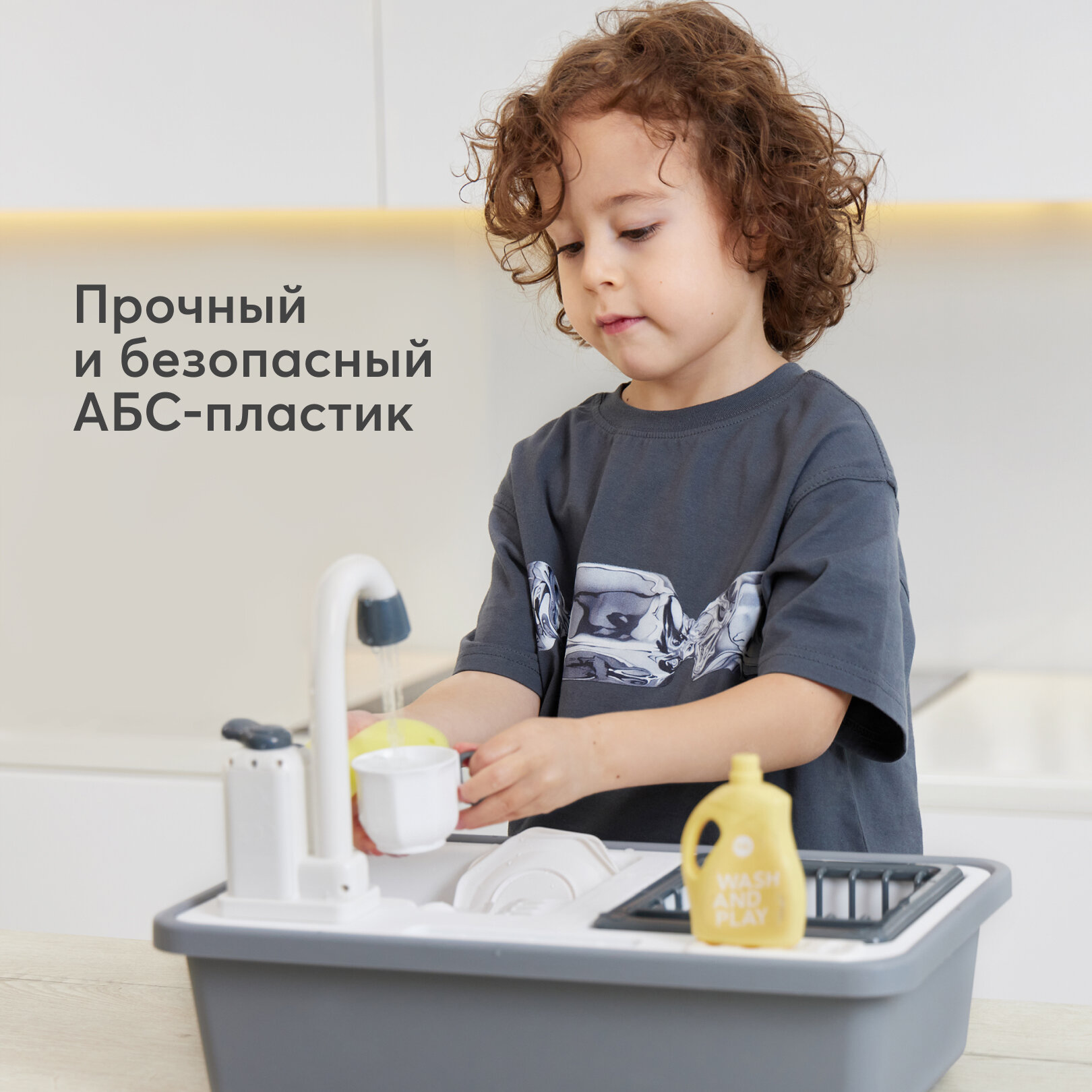 331869, Игрушечная раковина с водой WASH AND PLAY Happy Baby, игровой набор для детской кухни, 15 предметов, серый интересное: