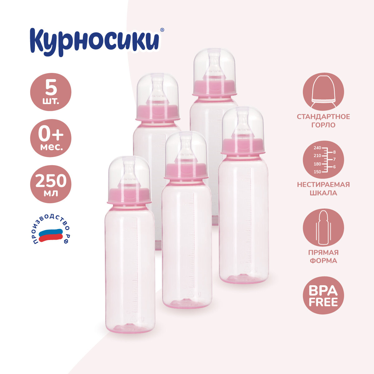 Купить Бутылочка для кормления новорожденного Курносики с силиконовой соской молочной 250 мл и 125 мл, набор из 5 штук, розовый