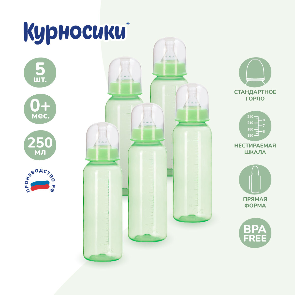 Купить Бутылочка для кормления новорожденного Курносики с силиконовой соской молочной 250 мл, набор из 5 штук, зеленый