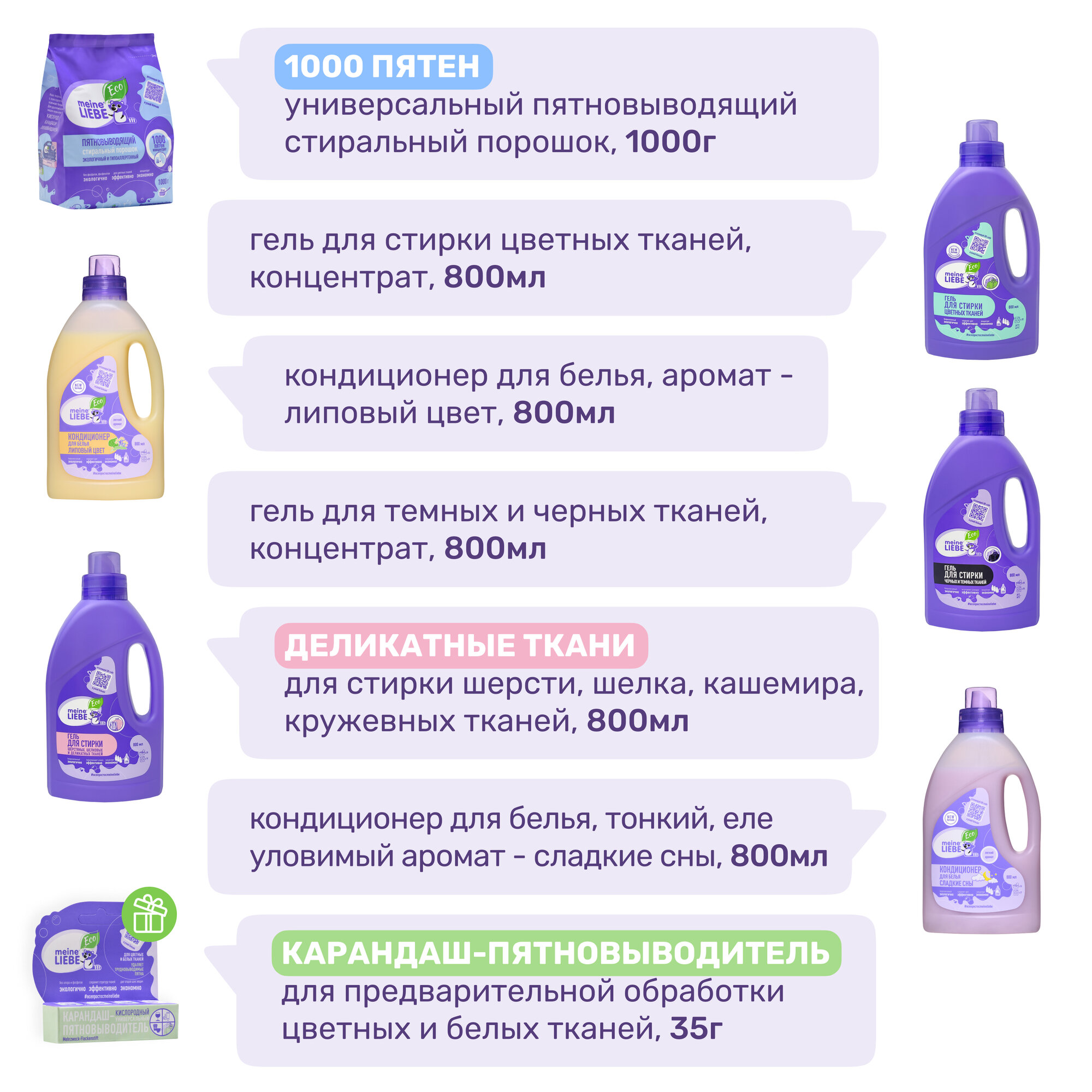 | Подробная комплектация | экологичный универсальный стиральный порошок-концентрат без фосфатов,хлора и энзимов 1кг, биоразлагаемый гель-концентрат для стирки шерстяных, шелковых и деликатных тканей эко без фосфатов, хлора и энзимов 800 мл, биоразлагаемый гель-концентрат для стирки цветных тканей эко 800мл, биоразлагаемый гель-концентрат для стирки черных и темных тканей эко 800мл, биоразлагаемый кондиционер для белья «сладкие сны» эко концентрат 800мл, биоразлагаемый кондиционер для белья «липовый цвет» эко концентрат 800мл, кислородный карандаш-пятновыводитель универсальный эко, без хлора, фосфатов |