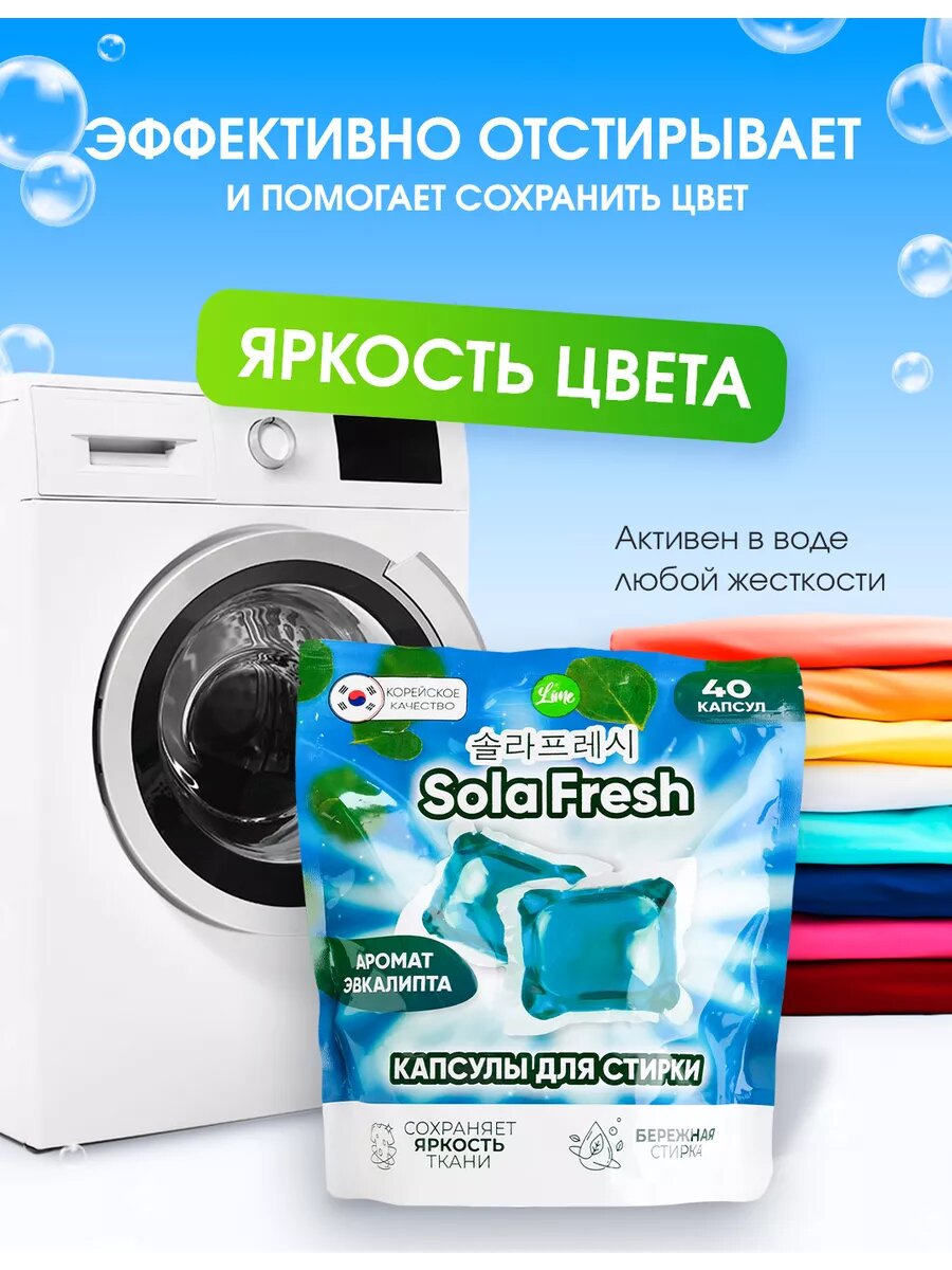 Капсулы для стирки SolaFresh LIME аромат эвкалипта 40шт, мягкая упаковка интересное: