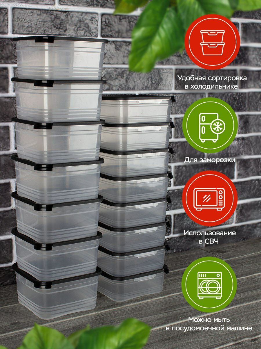 Набор пластиковых контейнеров для хранения и заморозки, Ангора, 0,7 и 1 литр, 15 штук, черный