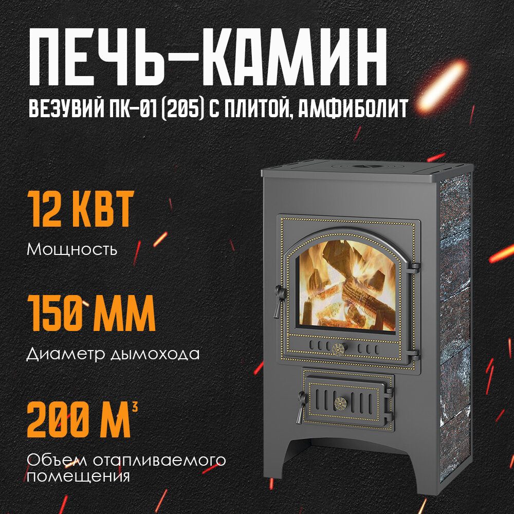 Купить Печь-Камин везувий ПК-01 (205) с плитой, амфиболит 12 кВт (200 м3) Ø 150 мм