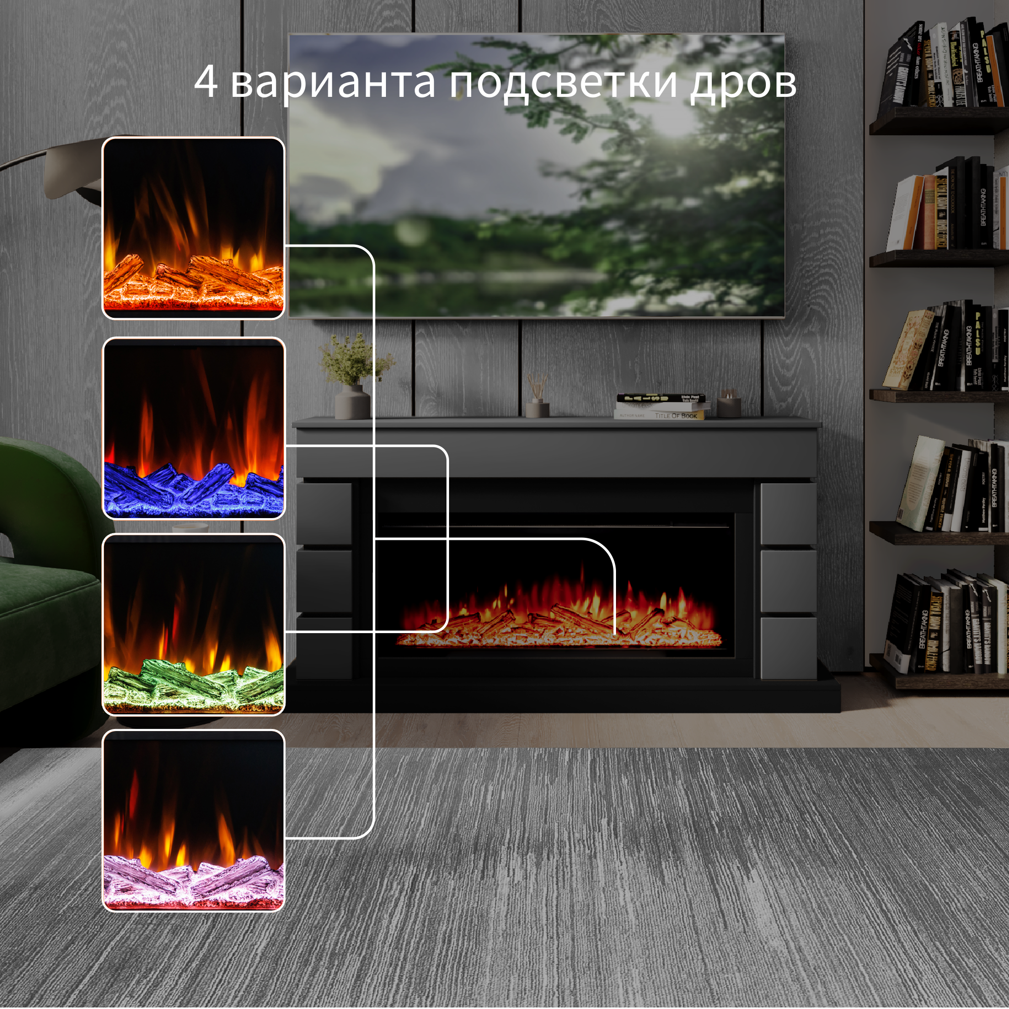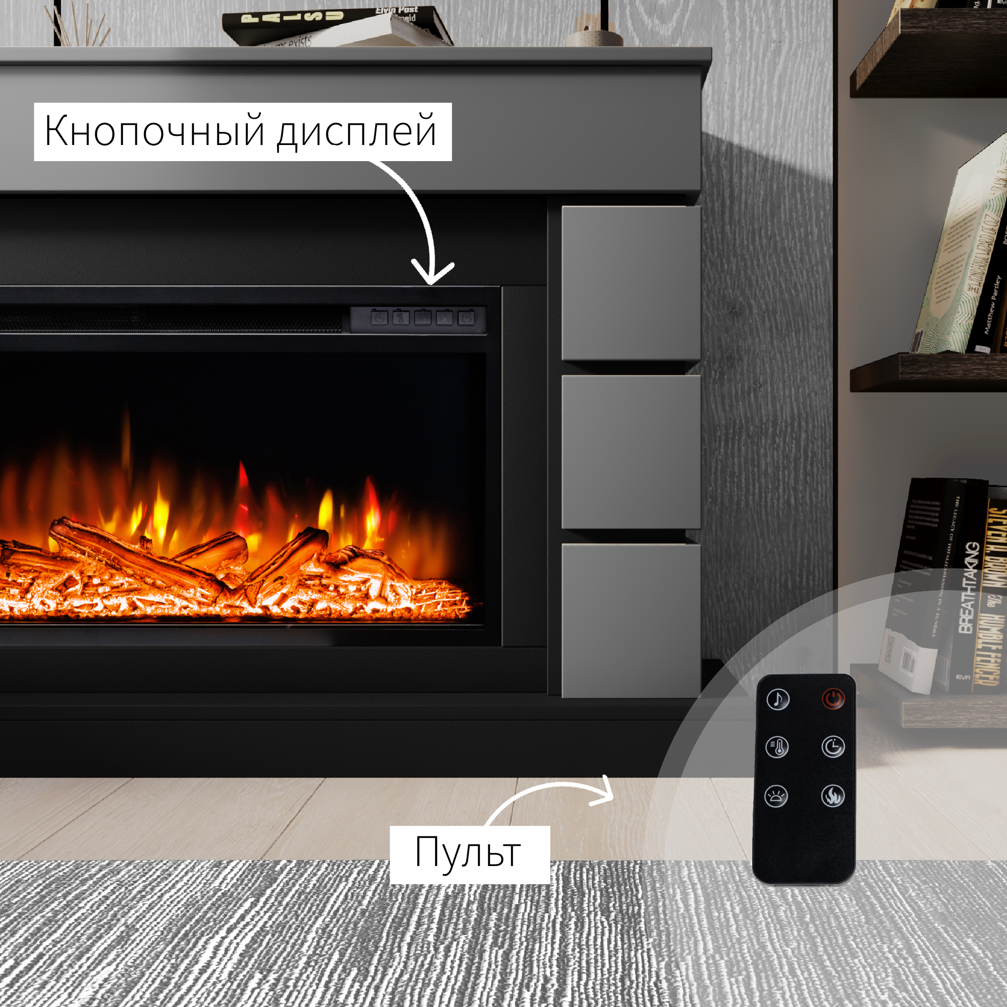 Камин электрический ELEKAM Silver чёрный с очагом Velar с пультом, обогревом и звуком потрескивания дров (Электрокамин)