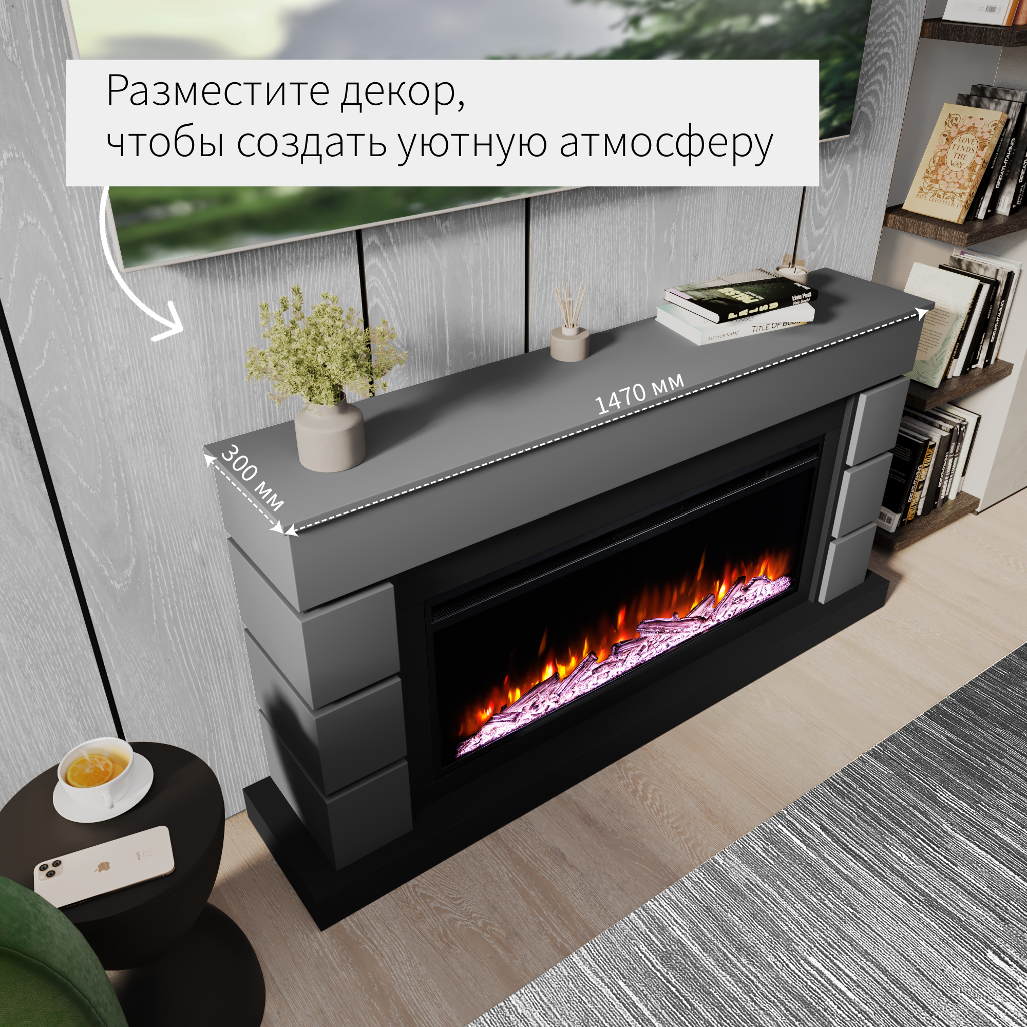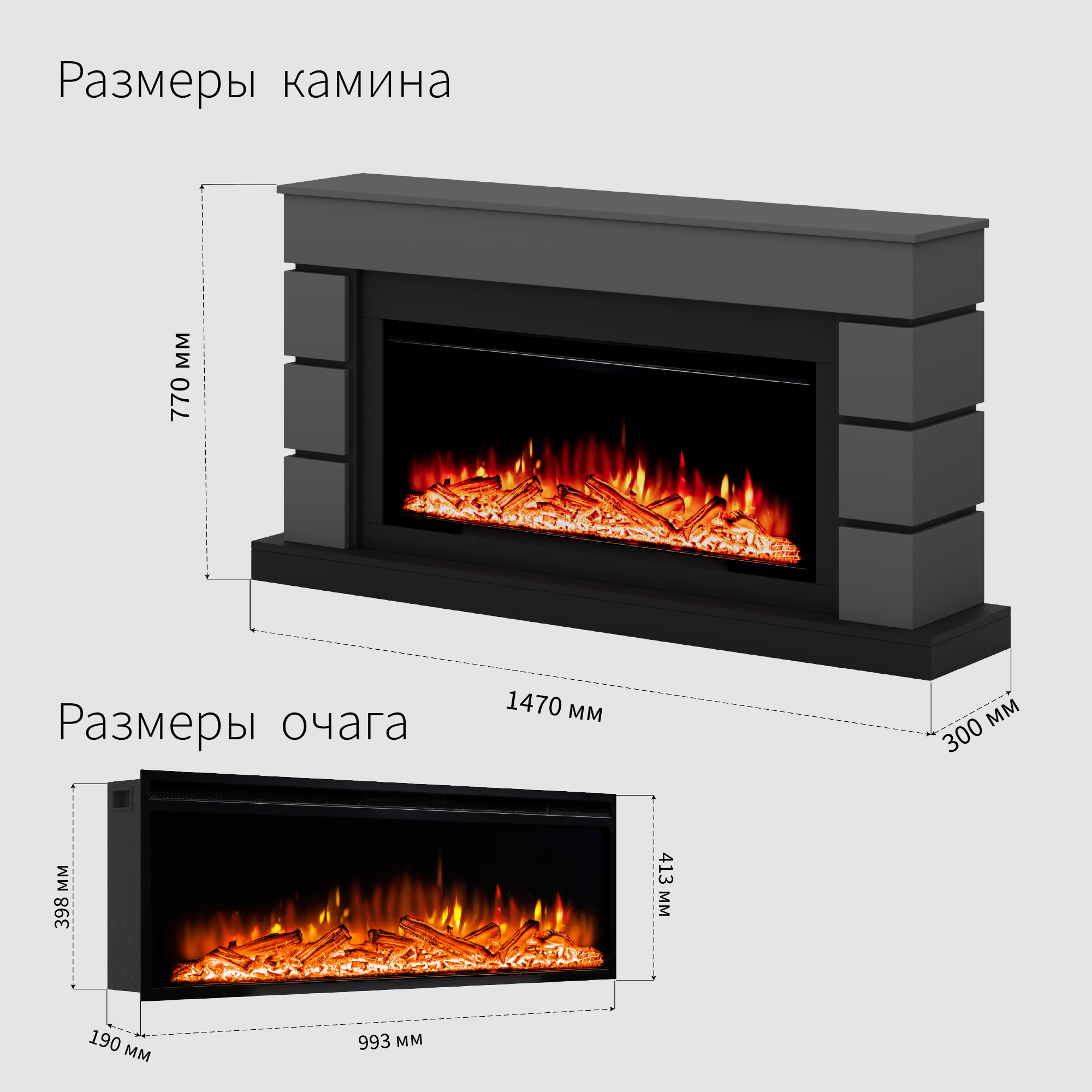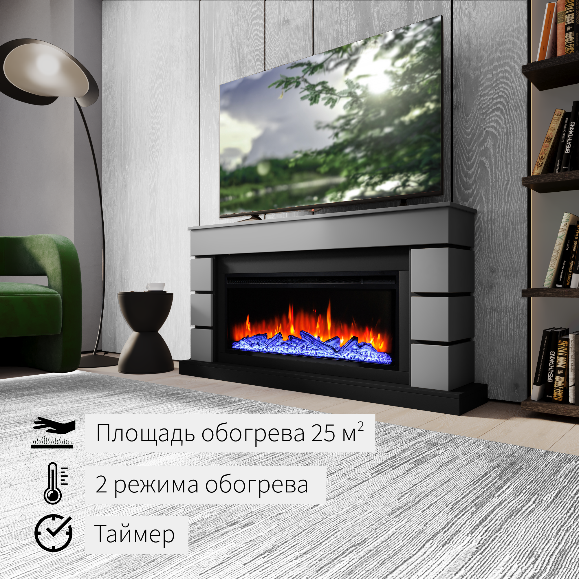 Электрический камин ELEKAM NEO серый + чёрный с очагом Vegas с обогревом, пультом управления и потрескиванием дров