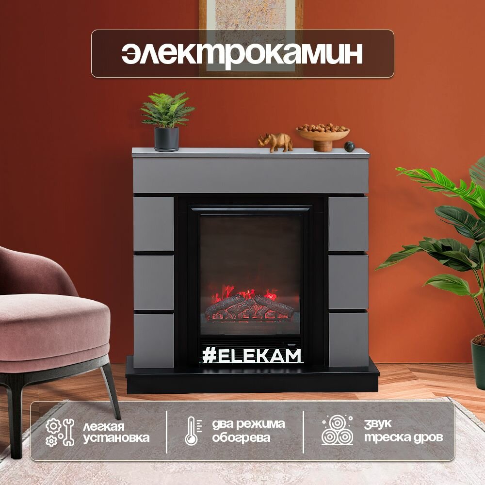 Электрический камин ELEKAM NEO серый + чёрный с очагом Vegas с обогревом, пультом управления и потрескиванием дров
