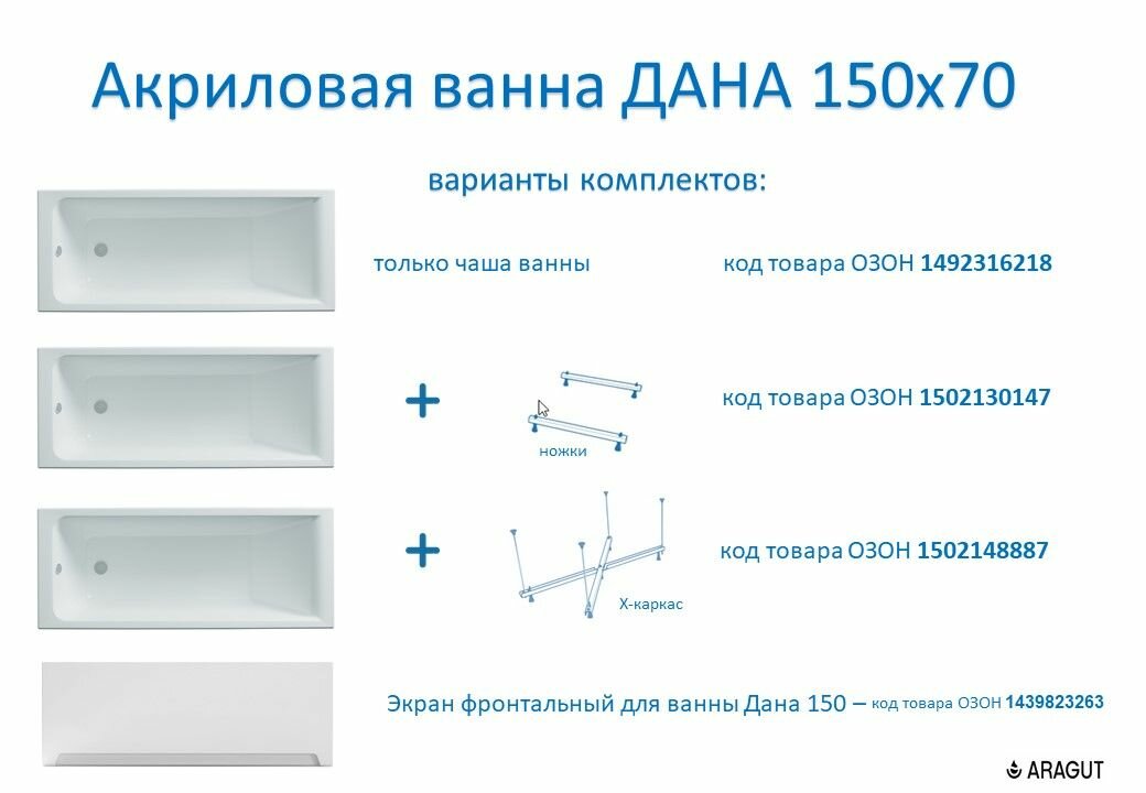 Акриловая ванна ARAGUT Дана 150х70 прямоугольная, в комплекте с ножками, белая интересное: