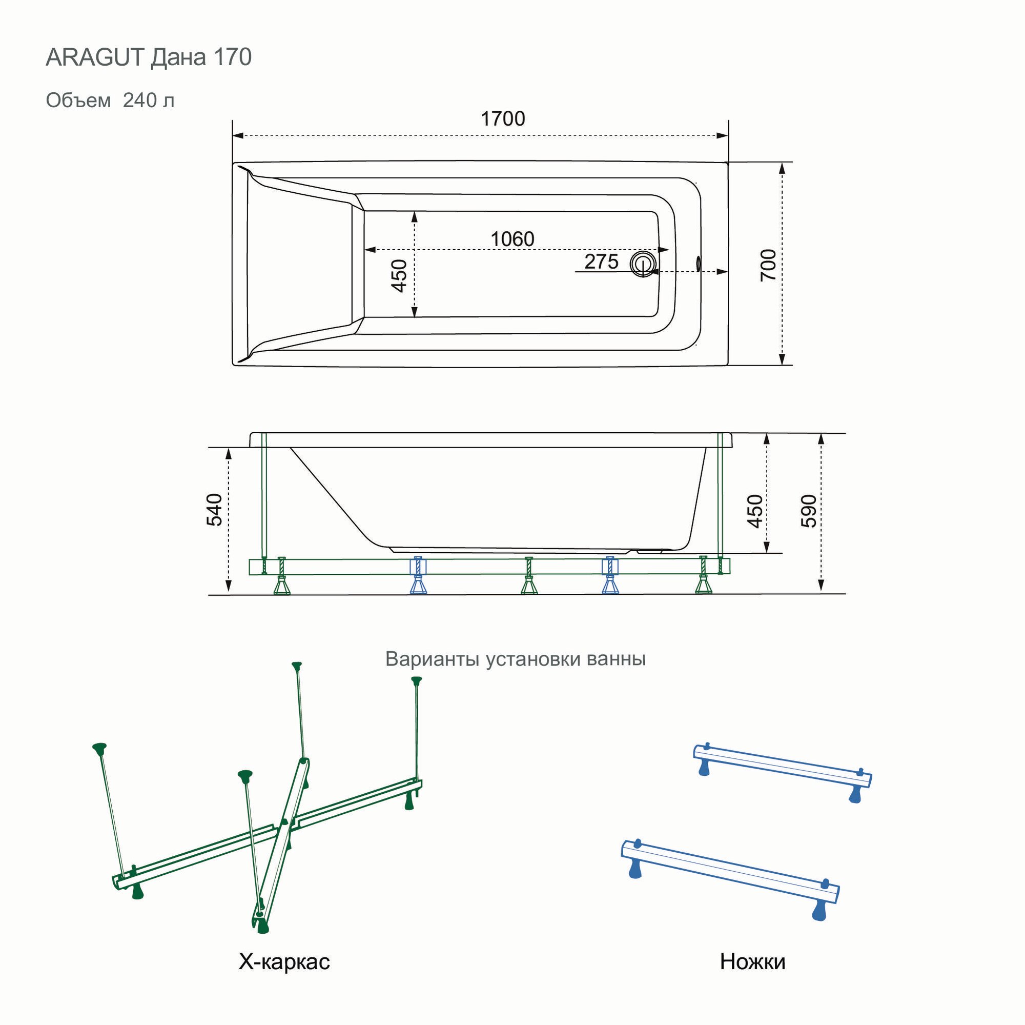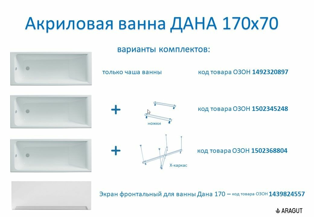 Акриловая ванна ARAGUT Дана 170х70 прямоугольная в комплекте с ножками, белая интересное: