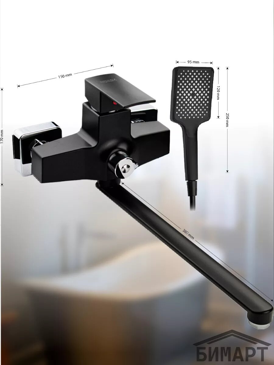 BRIMIX - Смеситель в ванную, длинный излив, шаровый, из высокопрочного пластика АБС, черный, квадратный корпус