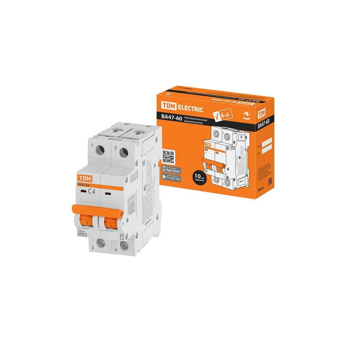 Автоматический выключатель ВА47-60 2Р 4А 6кА х-ка С TDM SQ0223-0087 (1 шт.)