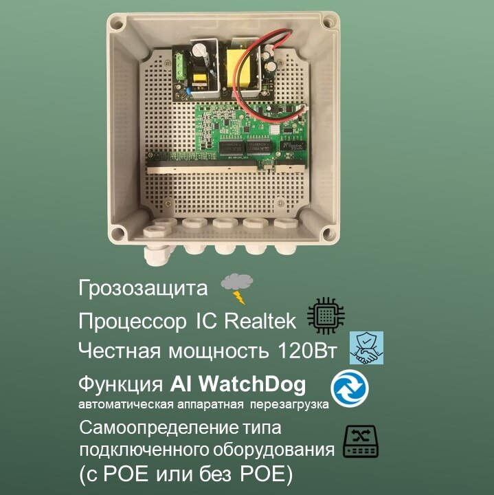 СохранитьУличный POE(свитч) 8POE+2Uplink,100 Мбит/с, WatchDog, Бюджет 120 Ватт,switch IC REALTEK интересное: