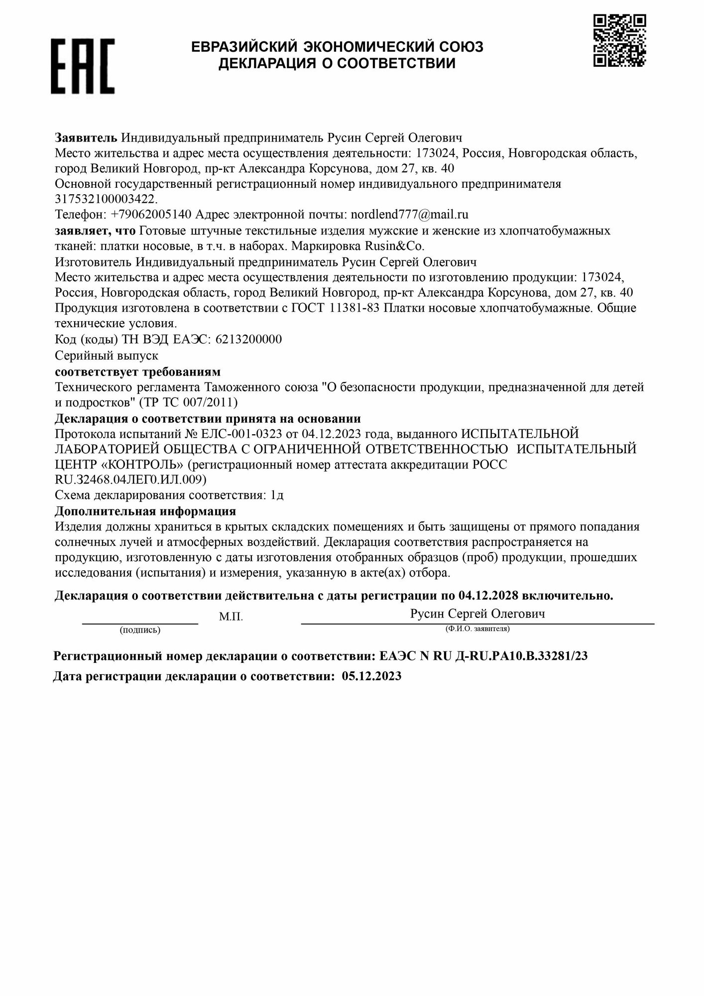 | Подробная комплектация | 6 шт носовых платков разной расцветки, упаковка с клеевым клапаном |