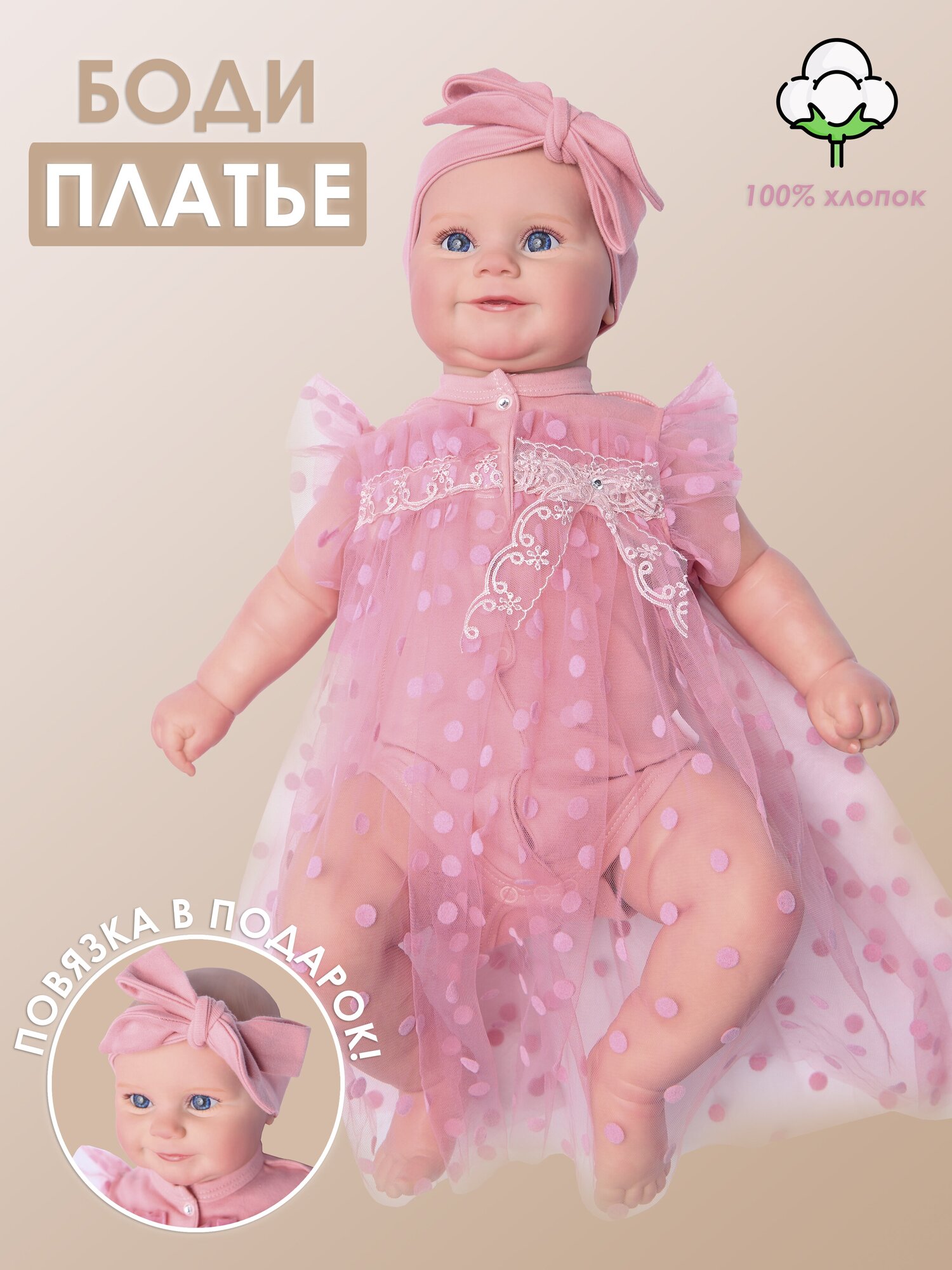 Боди Платье с юбкой "Горох" пудра Комплект на выписку для новорожденной девочки 56-62 интересное: