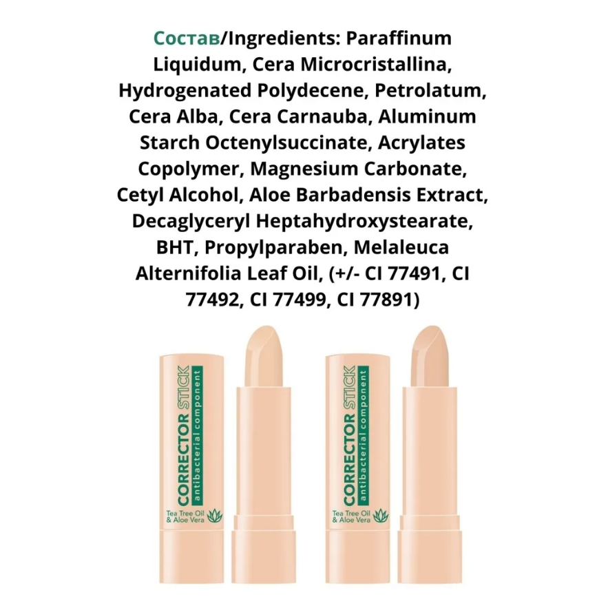 | Состав | paraffinum liquidum, cera microcristallina, hydrogenated polydecene, petrolatum, cera alba, cera carnauba, aluminum starch octenylsuccinate, acrylates copolymer, magnesium carbonate, cetyl alcohol, aloe barbadensis extract, decaglyceryl heptahydroxystearate, bht, propylparaben, melaleuca alternifolia leaf oil, (+/- ci 77491, ci 77492, ci 77499, ci 77891) |