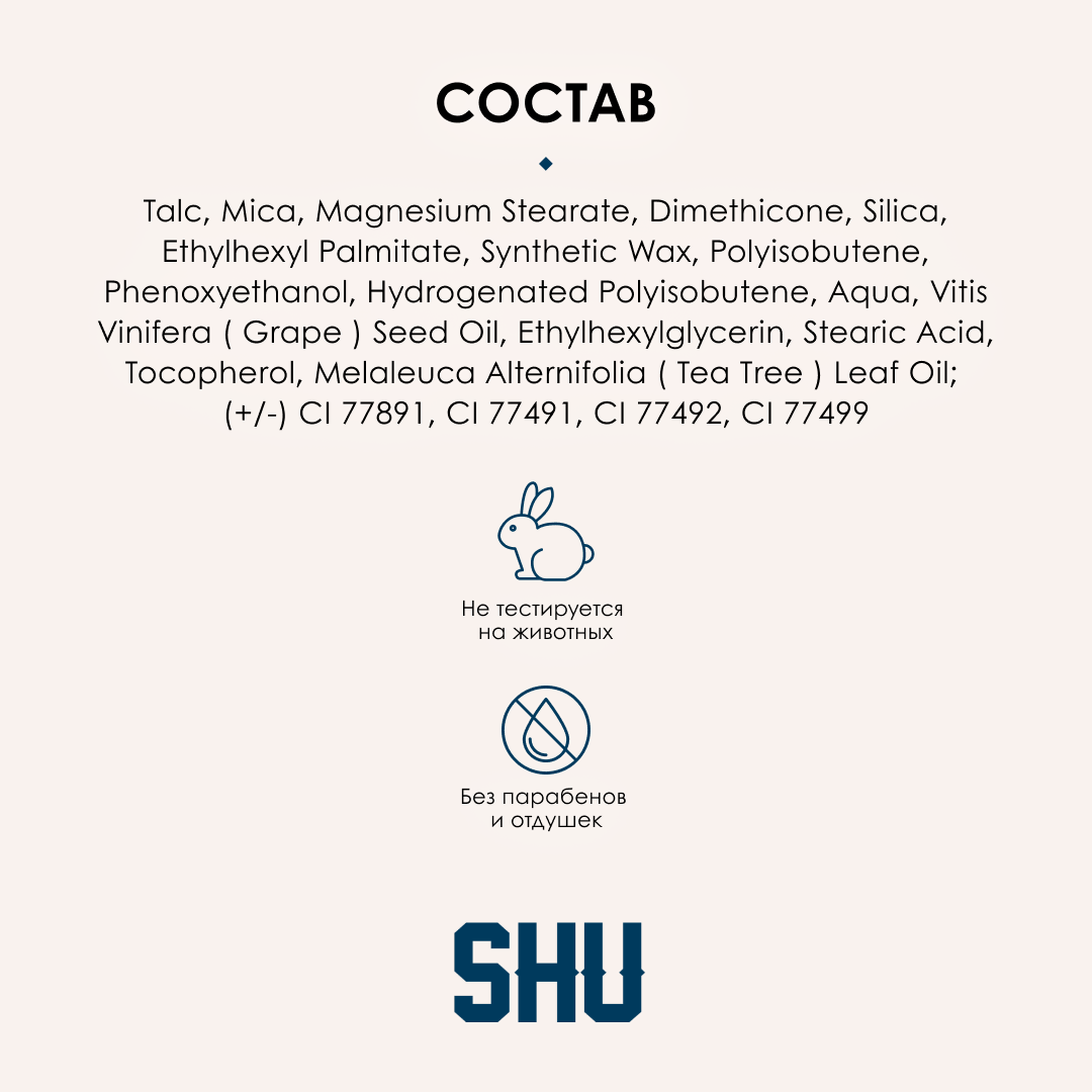 | Состав | talc, mica, magnesium stearate, dimethicone, silica, ethylhexyl palmitate, synthetic wax, polyisobutene, phenoxyethanol, hydrogenated polyisobutene, aqua, vitis vinifera (grape) seed oil, ethylhexylglycerin, stearic acid, tocopherol, melaleuca alternifolia (tea tree) leaf oil; (+/-) CI 77891, CI 77491, CI 77492, CI 77499 |
