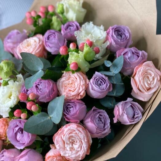 | Состав | роза пионовидная лавандер баблс - 5 шт. роза пионовидная мадам бомбастик - 6 шт.,эустома - 3 шт.,гиперикум - 3 шт.,эвкалипт - 5 шт.,упаковка крафт дизайнерский - 3 шт.,лента атласная - 1 шт. |