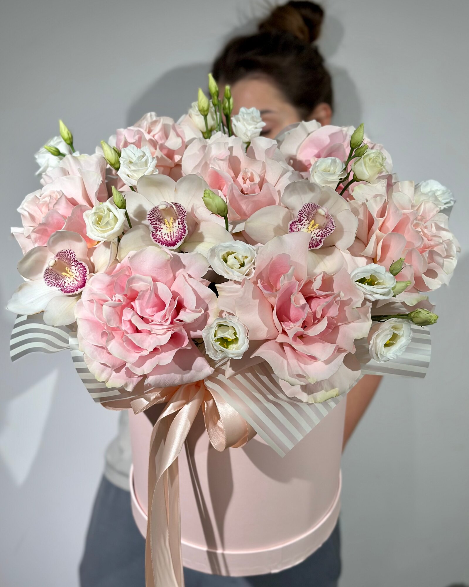 Французские розы с орхидей и эустомой в шляпной коробке и атласными лентами , композиция в коробке с доставкой