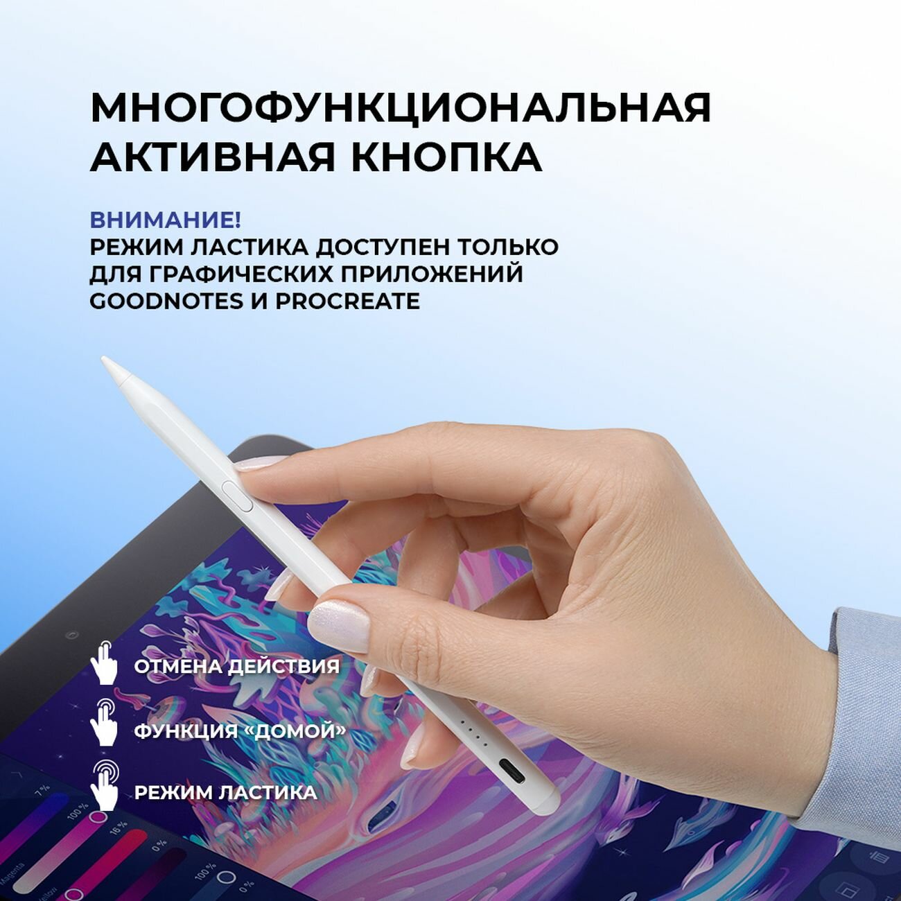 | Дополнительная информация | Серия: Magic Pencil. Время зарядки аккумулятора: до 30 минут. Материал корпуса: металл. Максимальное время работы: до 12 часов. Время в режиме ожидания: до 95 дней. Разъем USB Type-С: 1 |