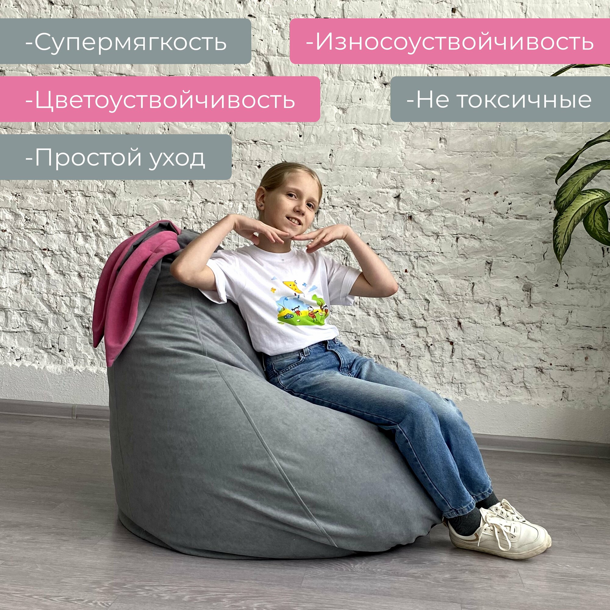 СохранитьКресло-груша для детей и взрослых АртБинБэг «Ушастик», ткань "Велюр", светло-серый с розовыми ушами, размер XXL интересное: