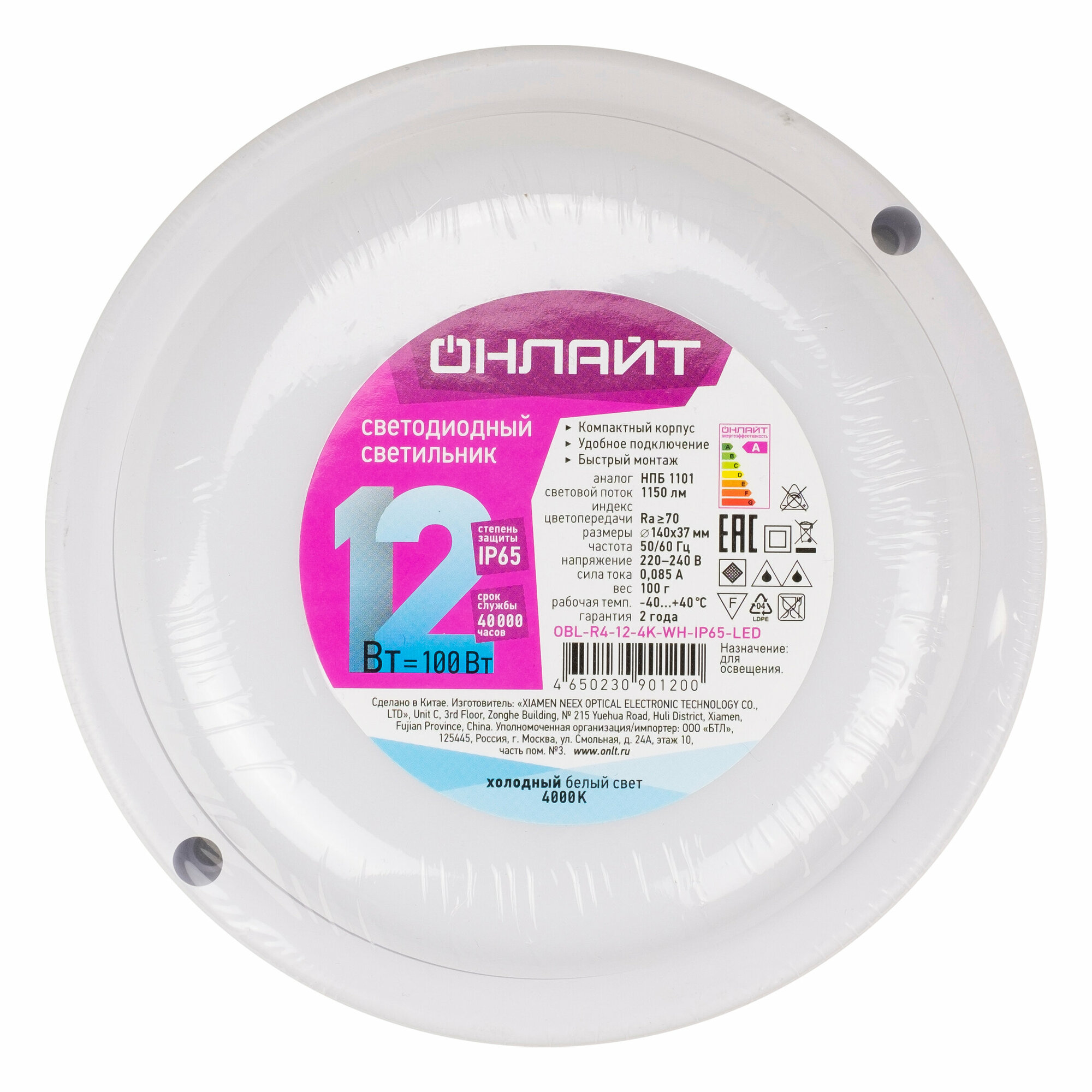 Светильник пылевлагозащищенный онлайт 90 121 OBL-R4, 12 Вт, холодного света 6500К, IP65, белый
