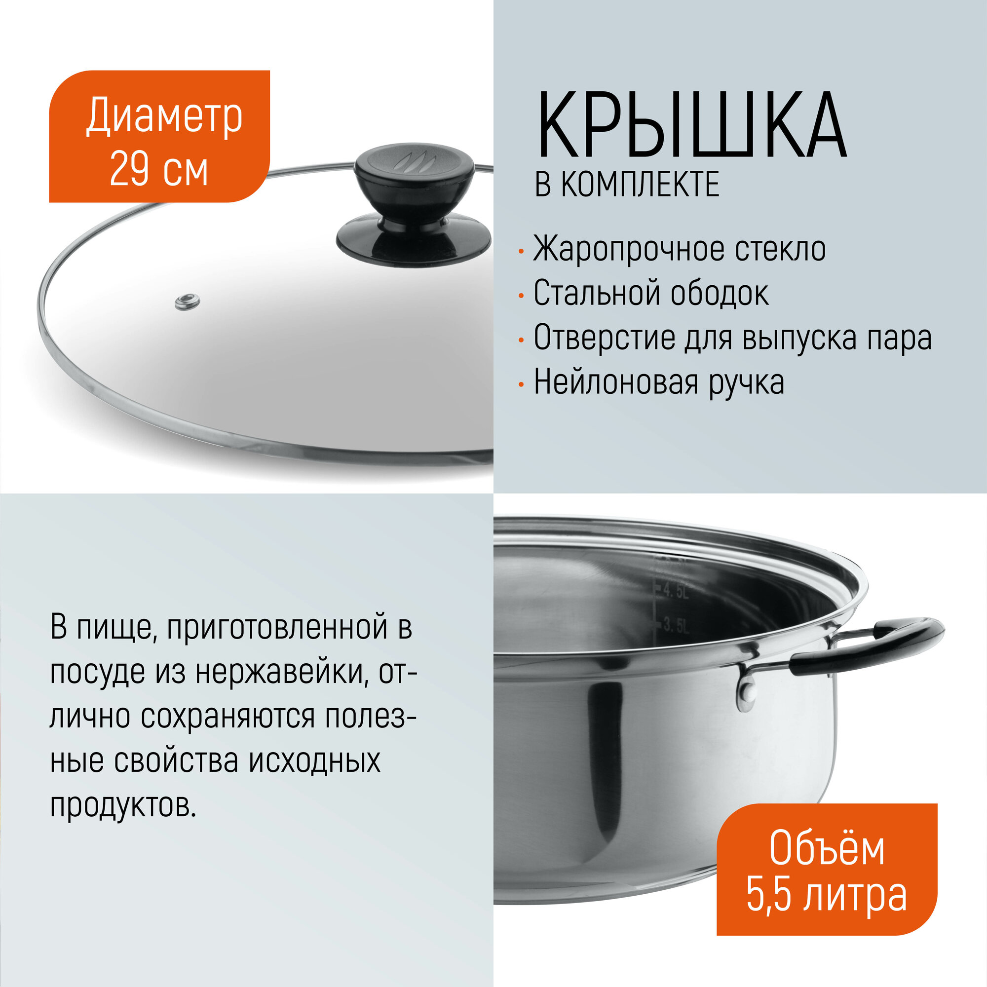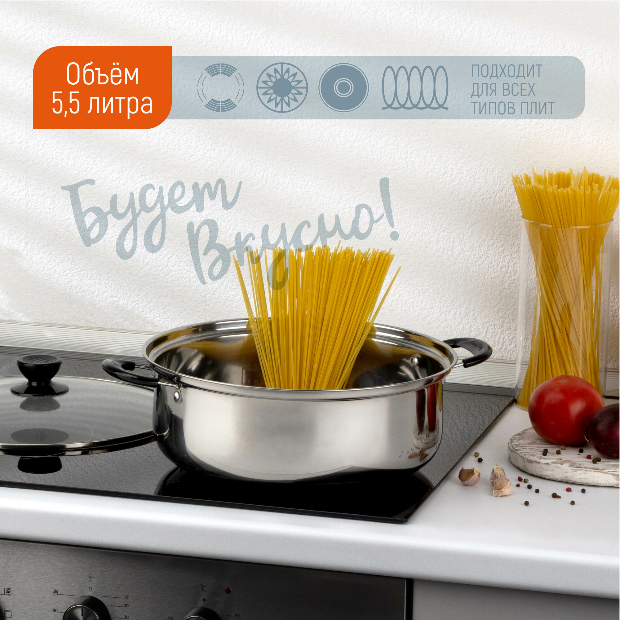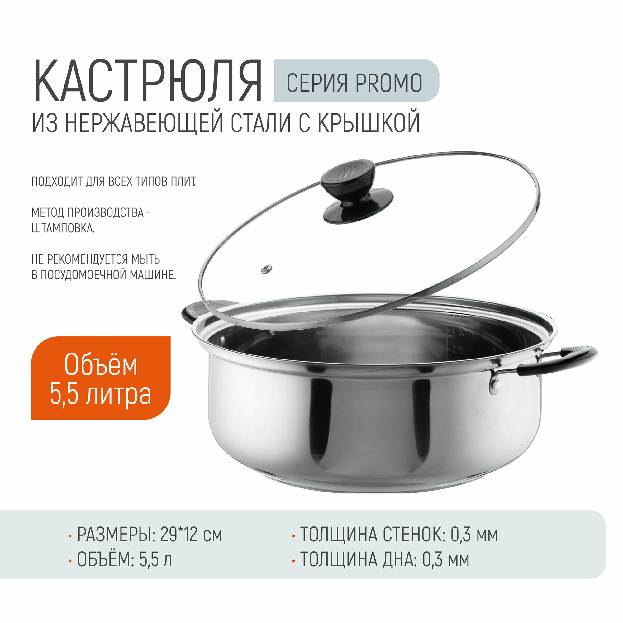 Купить Кастрюля Promo, объем 5,5 л, из нержавеющей стали с крышкой из жаропрочного стекла