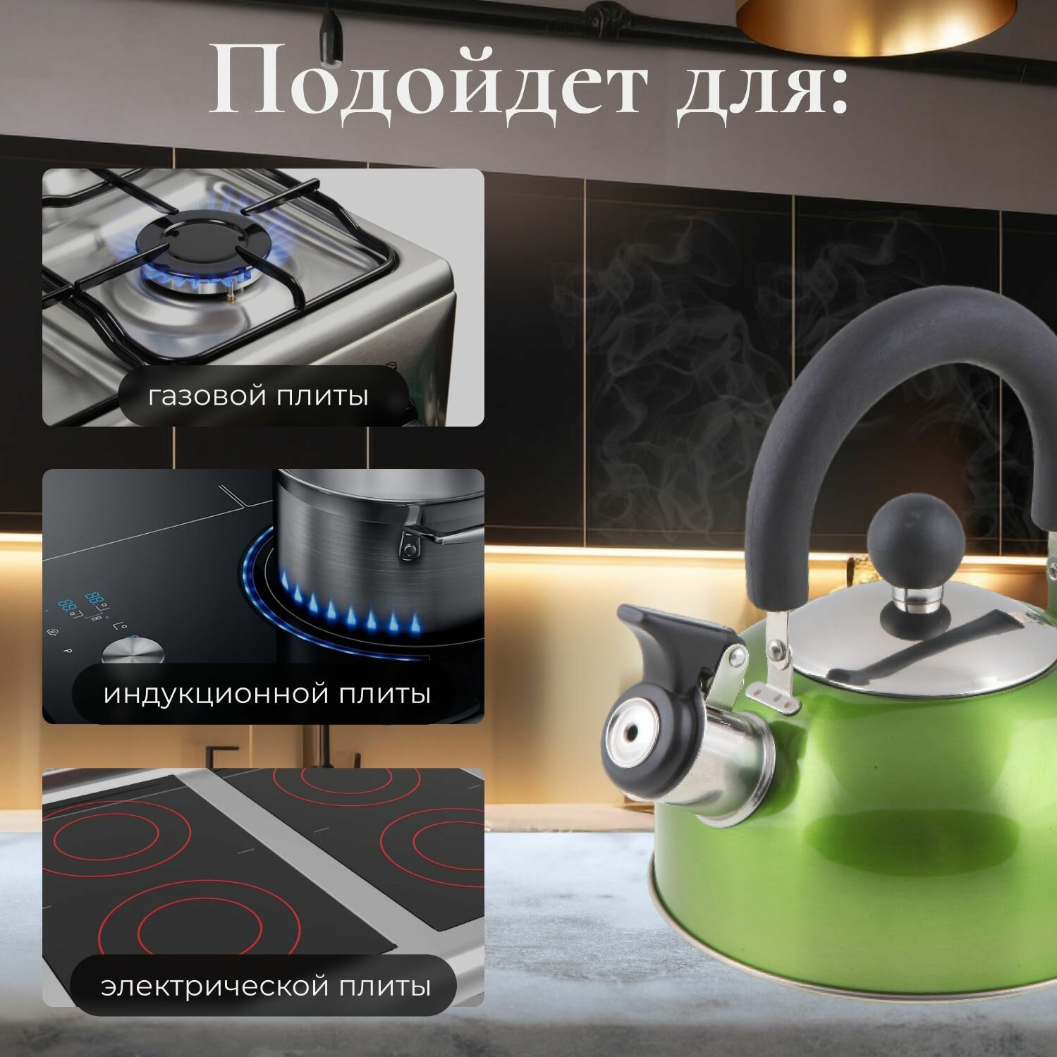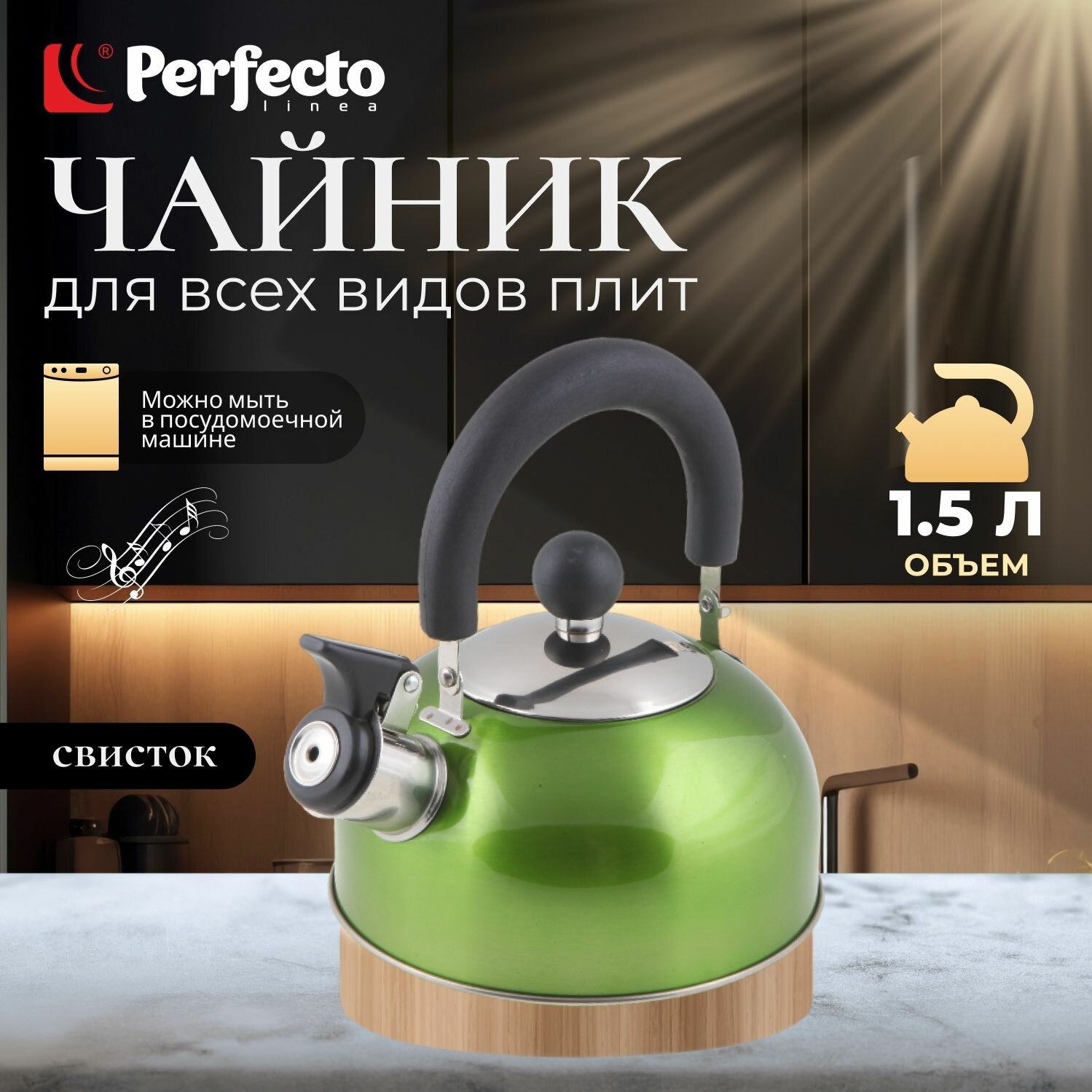 Купить Чайник со свистком 1,5 л PERFECTO LINEA серия Holiday, нержавеющая сталь, цвет зеленый металлик (52-112013)