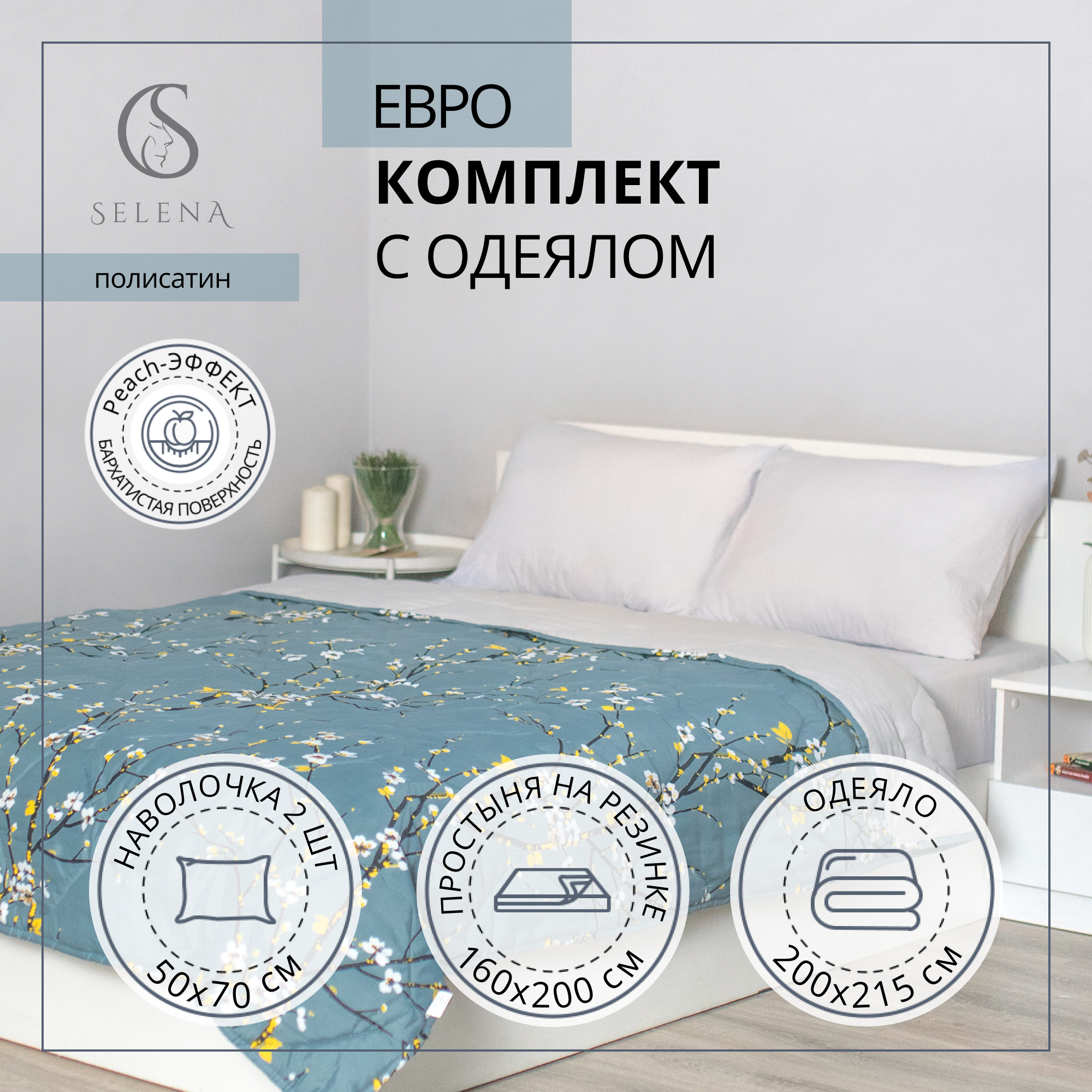 Комплект постельного белья с одеялом SELENA Блоссом евро из хлопка, полисатин, наволочка 2 шт