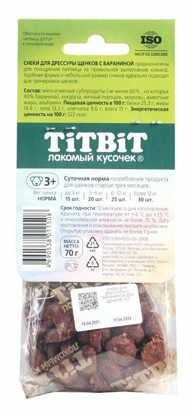 Лакомство TiTBiT Снеки для дрессуры с бараниной для щенков (70 г) интересное:
