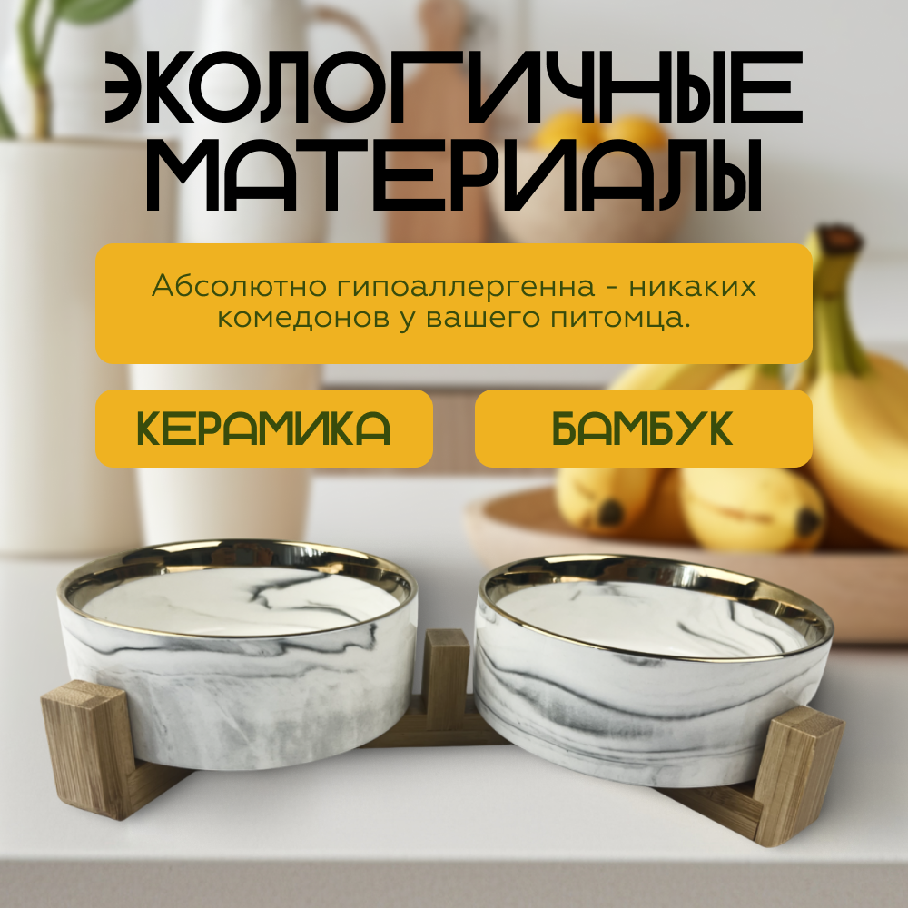 Набор мисок для животных ZooWell Aura на деревянной подставке, цвет белый мрамор, 2 шт по 850мл