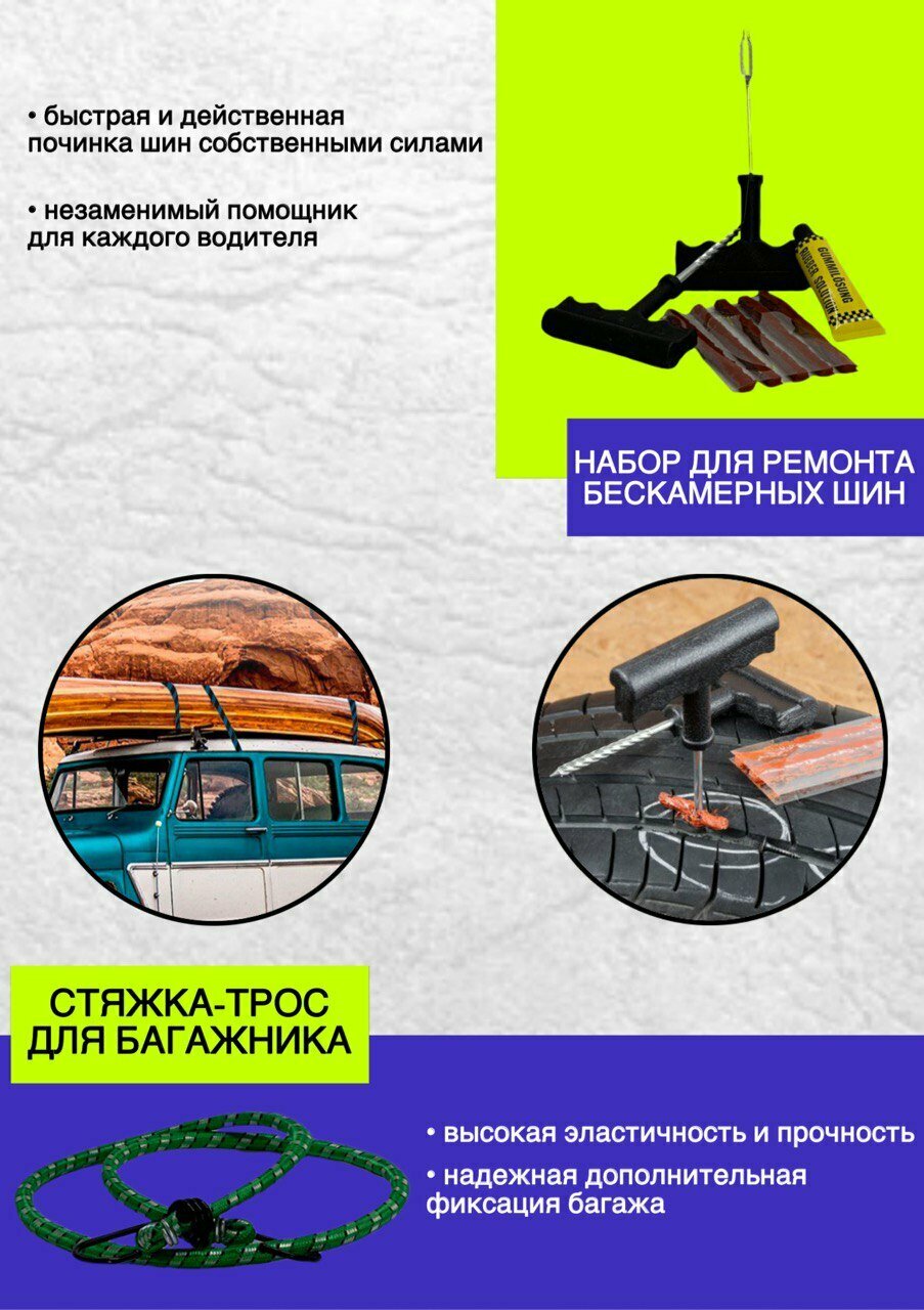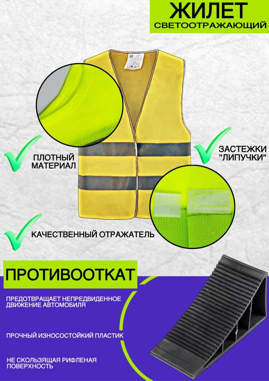 | В наборе | аптечка / дождевик / жилет светоотражающий / знак аварийной остановки / огнетушитель / перчатки / ремкомплект для б/к шин / трос буксировочный / упор(башмак) противооткатный |