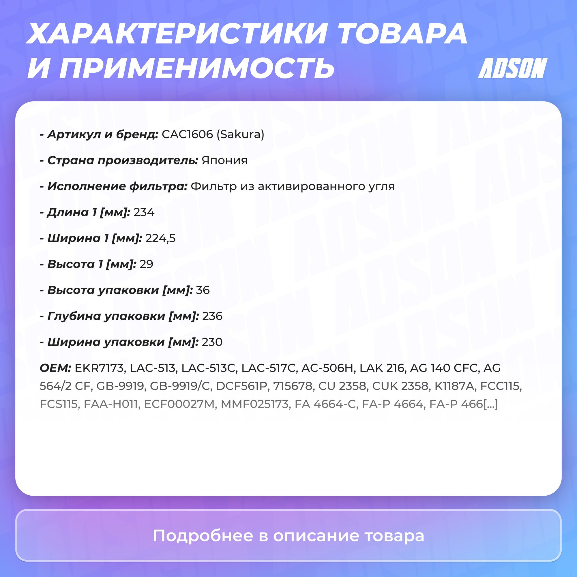 | Дополнительная информация | ширина: 224.5 мм; толщина: 29 мм; длина: 234 мм; фильтрующий материал: уголь |
