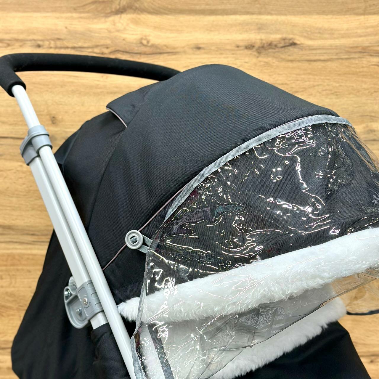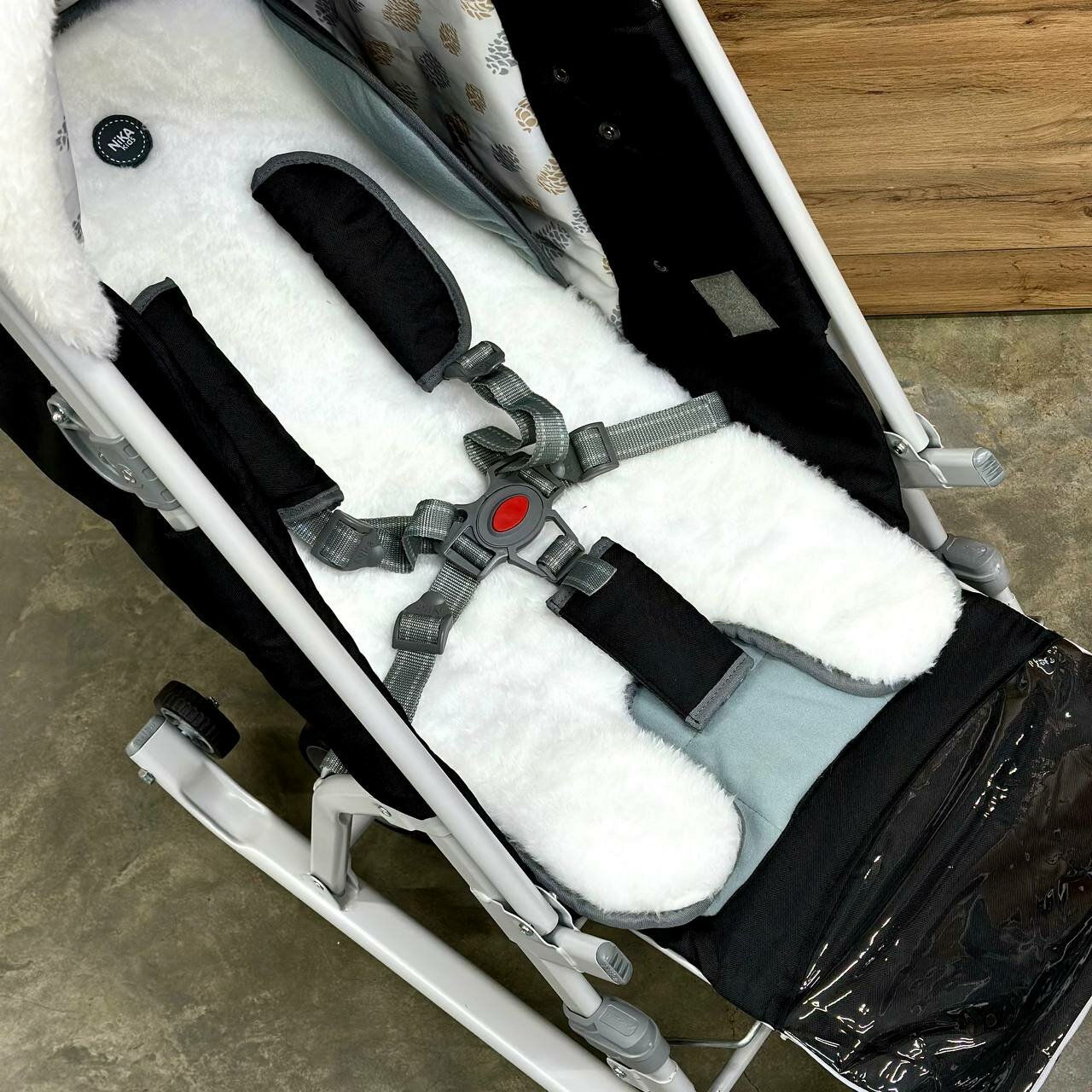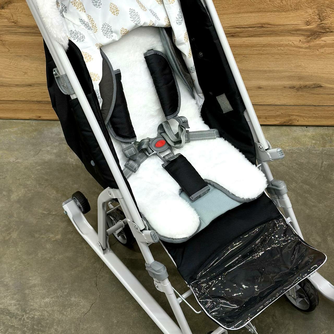 | Дополнительная информация | плоские полозья 40 мм; дискретное перемещение козырька (трещетка); подножка для ног с регулируемым углом наклона; светоотражающий кант; смотровое окошко для наблюдения за ребенком; сумка с кармашками для полезных мелочей; обрезиненные колеса |