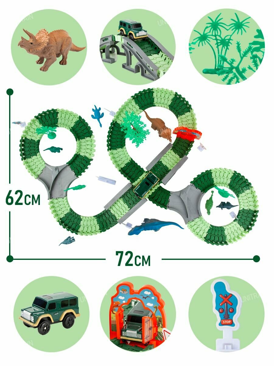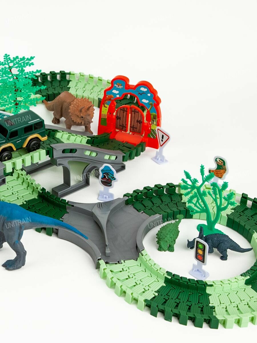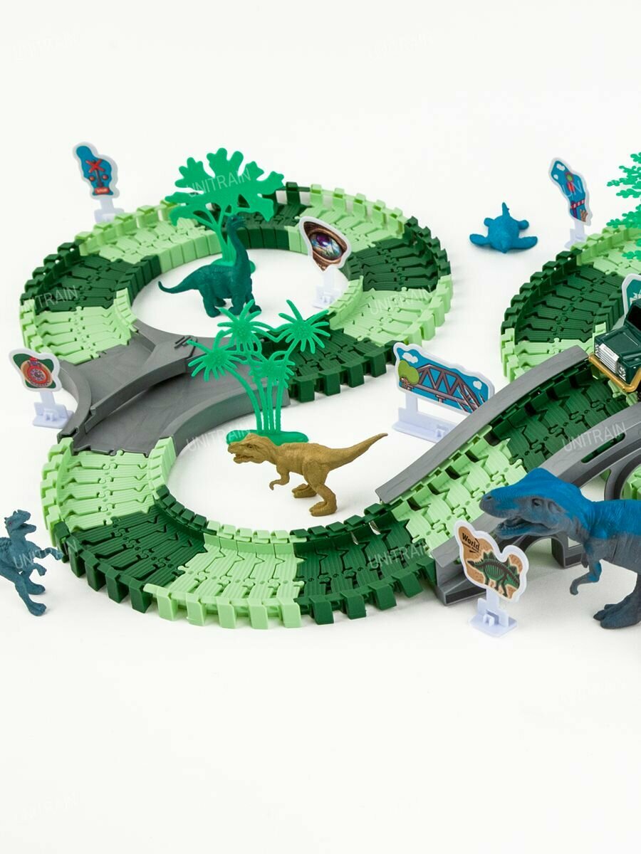 | Комплектация | 217 деталей: машинка с электромотором, 8 фигурок динозавров, 180 элементов для сборки трека, 4 элемента для моста, 1 ворота, 2 переводные стрелки, 11 дорожных знаков, элементы ландшафта. |