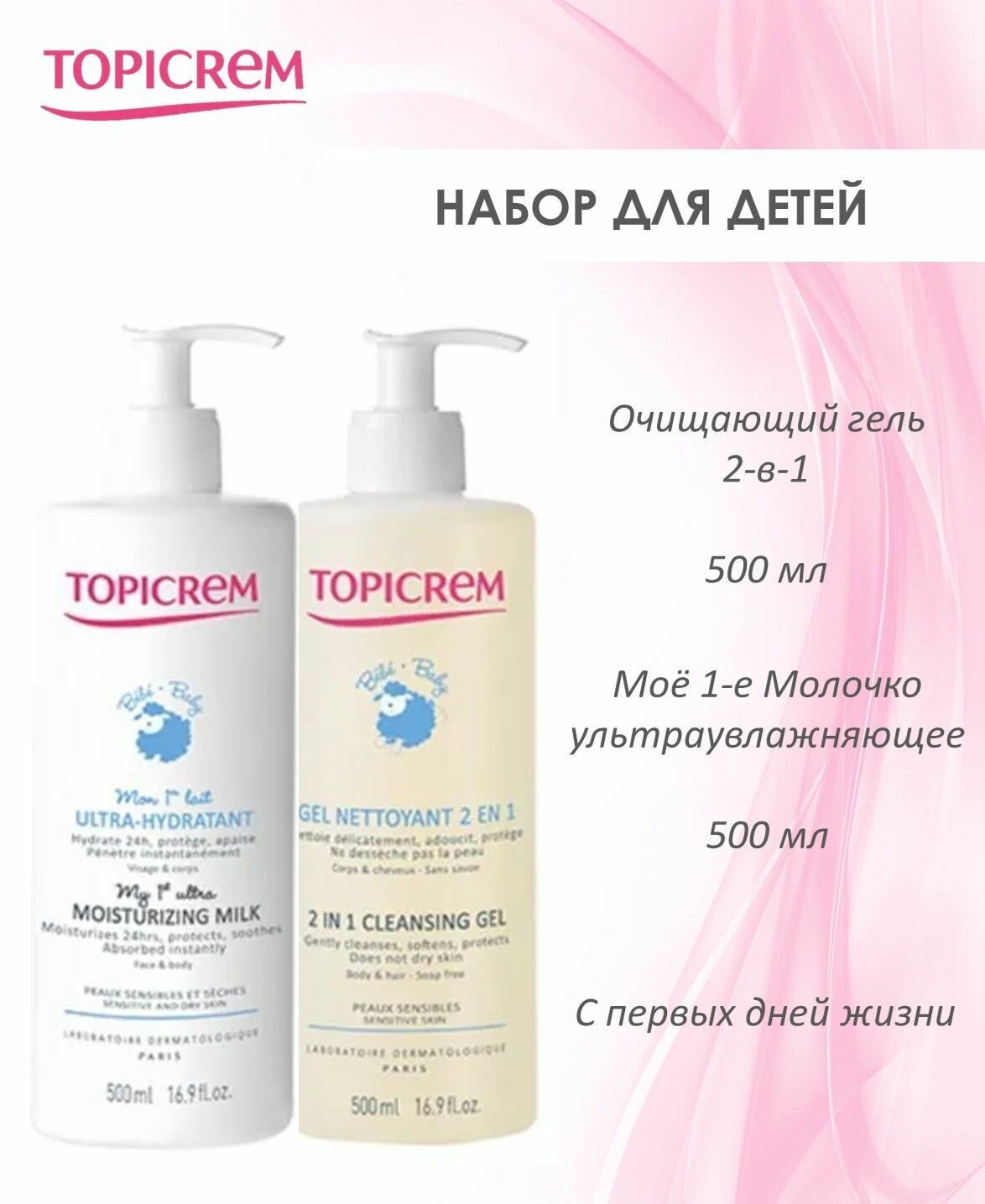 TOPICREM Набор для детей 0+: ультра-увлажняющее молочко 500 мл + очищающий гель 2в1 500 мл