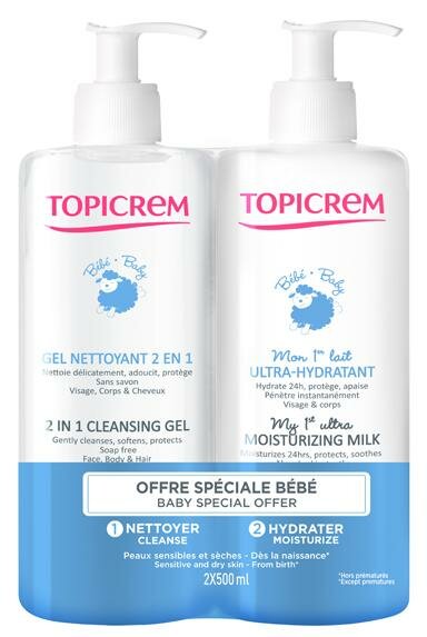 Купить Topicrem набор Мое 1-ое ультра-увлажняющее молочко, 500 мл + Очищающий гель 2 в 1, 500 мл
