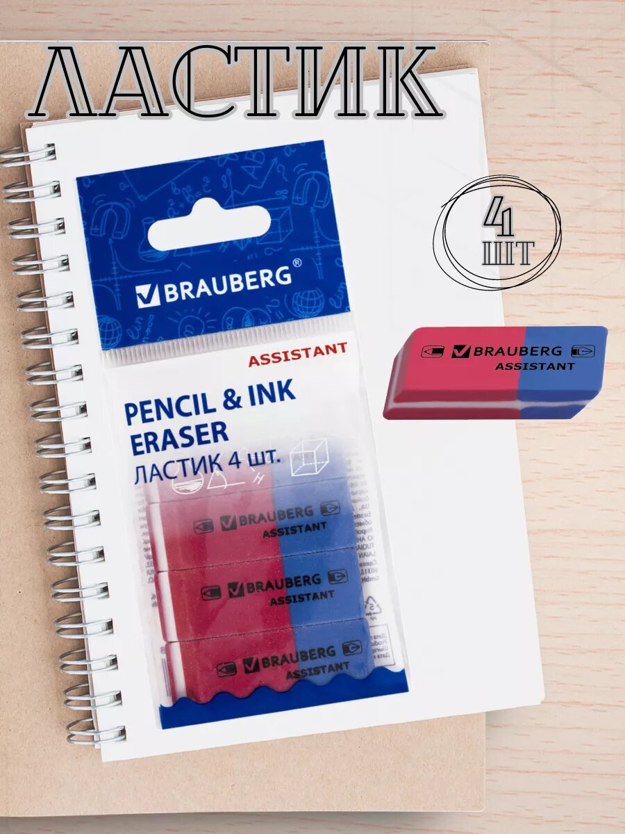 Купить Ластик Brauberg "Assistant 80", для карандашей и ручек, прямоугольный, ПВХ, красно-синий, 4 штуки
