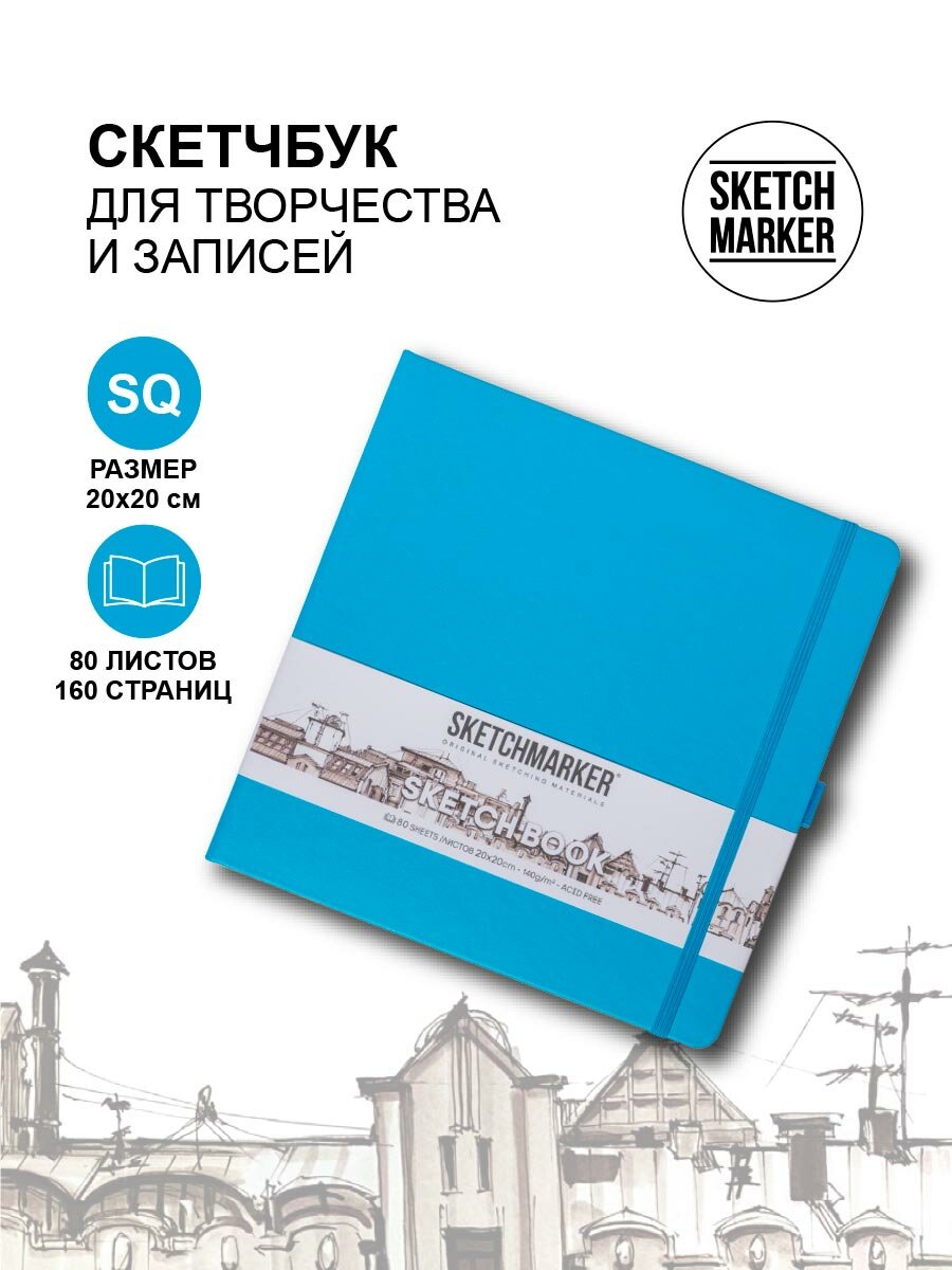 Скетчбук для рисования квадратный, блокнот для скетчинга SKETCHMARKER Sketchmarker 140г/кв. м 20*20cм 80л твердая обложка, цвет Аквамарин