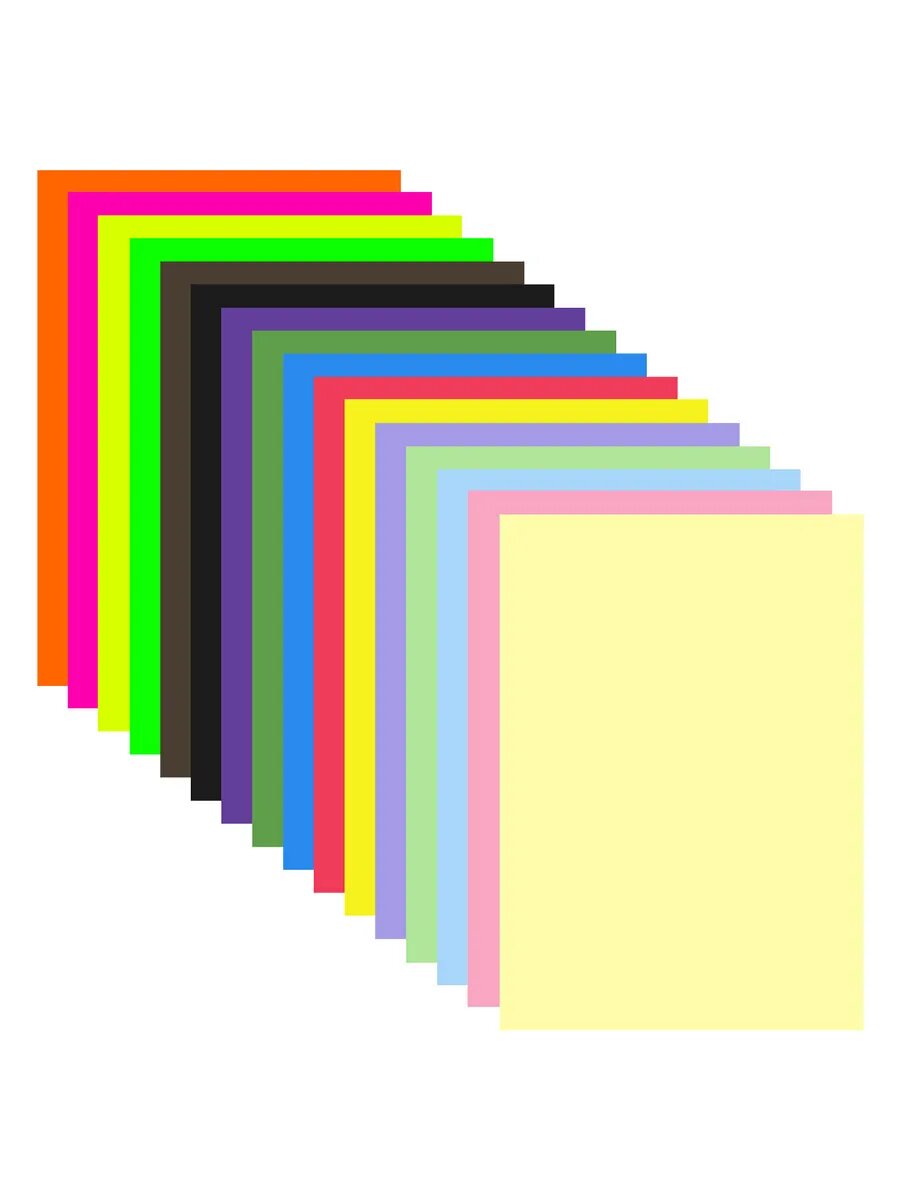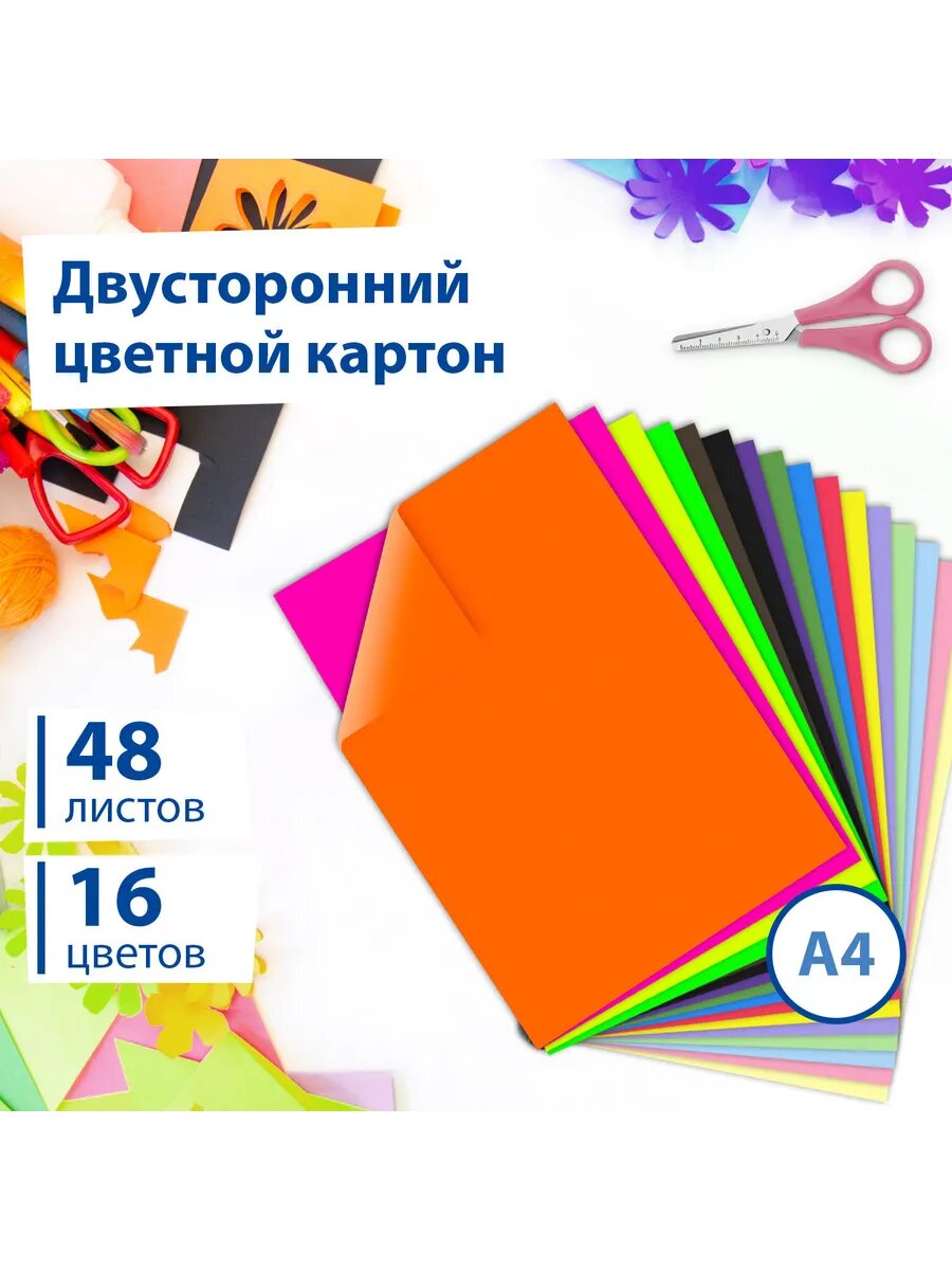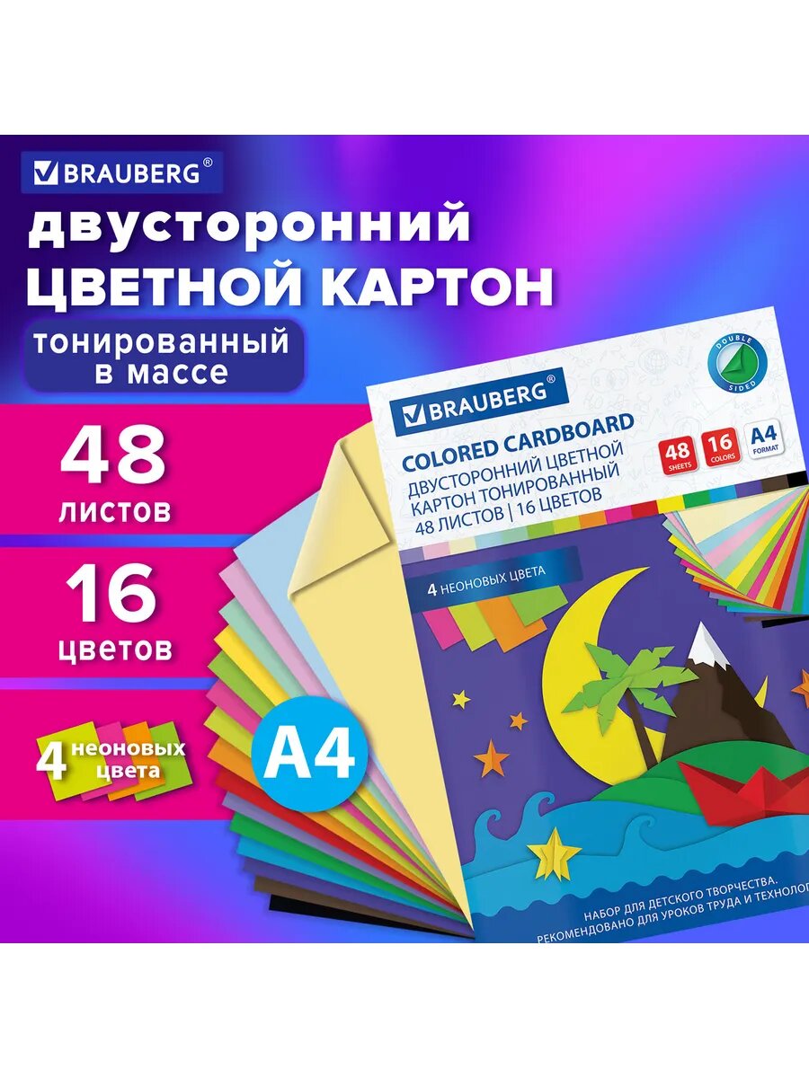 Картон цветной формата А4 тонированный в массе для творчества / оформления А4, 48 листов 16 цветов (+ неон), 180г/м2, Brauberg, 113507