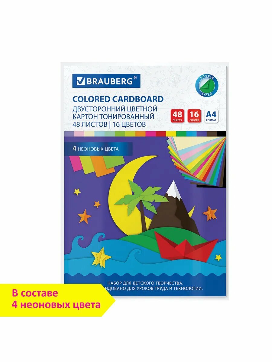 Комплект 2 шт, Картон цветной А4 тонированный В массе, 48 листов 16 цветов (+ неон), склейка, 180 г/м2, BRAUBERG, 113507