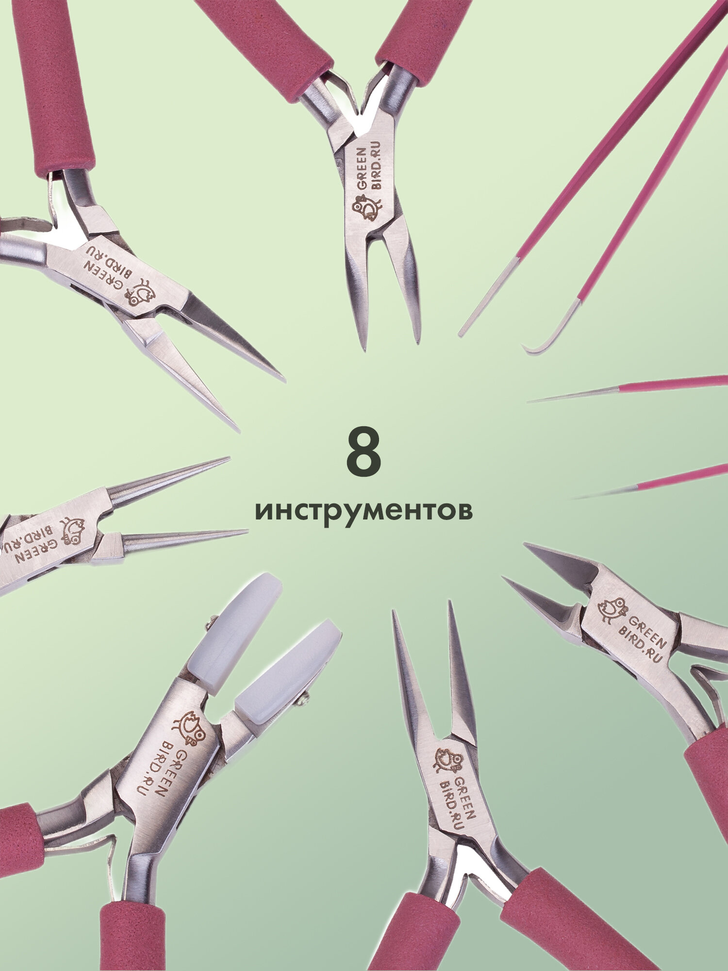 | Состав набора | круглогубцы / кусачки / пенал из искусственной кожи / пинцет / пинцет для двойных колечек / плоскогубцы с загнутыми концами / плоскогубцы с нейлоновыми зажимами / плоскогубцы с сужающимися концами / плоскогубцы с широкими концами |