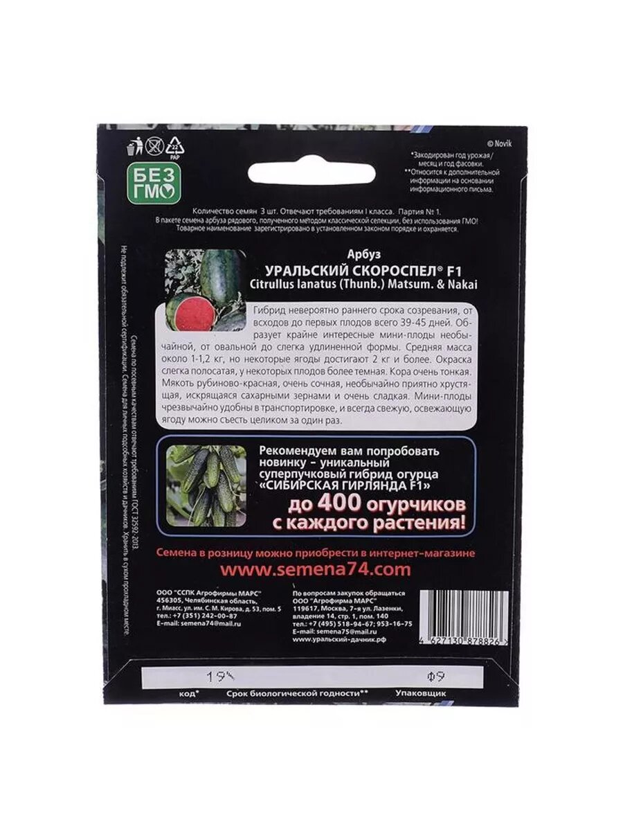 Купить Семена Арбуз "Уральский Скороспел". F1. 3 шт 5470796